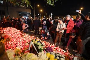 Mai multe persoane aprind lumanari in memoria victimelor incendiului de la clubul COLECTIV din Bucuresti, in Piata Victoriei din Timisoara, duminica, 1 noiembrie 2015.