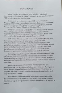 Chiar şi aşa conducerea spitalului din Făgăraş a închis Dispensarul TBC, ignorând cu bună ştiinţă sutele de pacienţi cu afecţiuni pulmonare. Relatarea acestei situaţii în Monitorul de Făgăraş a determinat conducerea spitalului să trimită un drept la replică în care acuză de situaţia creată la Dispensarul TBC, culmea, pe medicul pneumolog şi pe Monitorul de Făgăraş. Pe de altă parte întrebăm conducerea spitalului de ce n-a scos la concurs postul de medic pneumolog în momentul în care s-a pensionat medicul Codaia şi a preferat să încheie un contract pe termen scurt cu un alt medic?