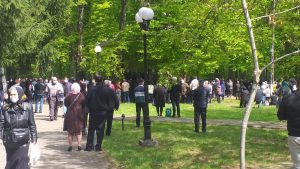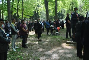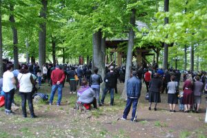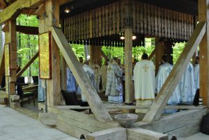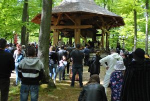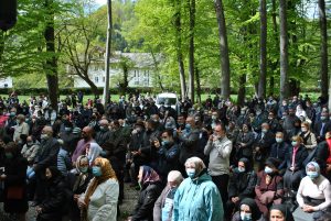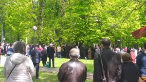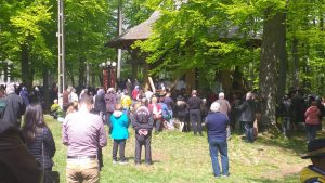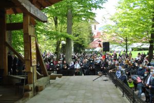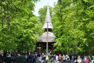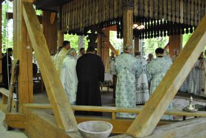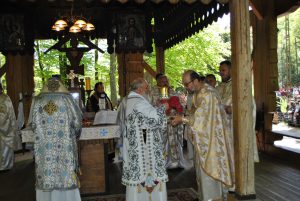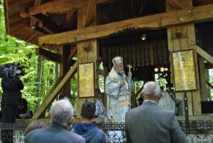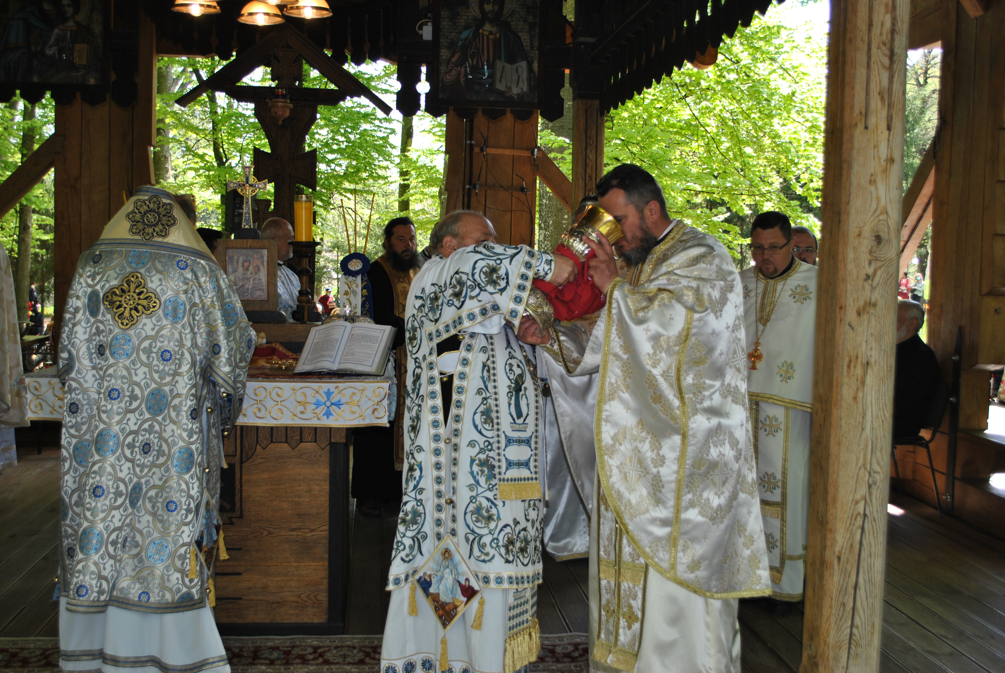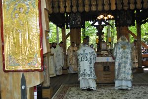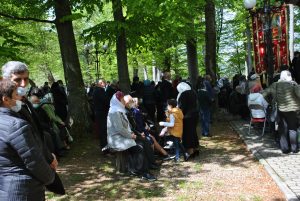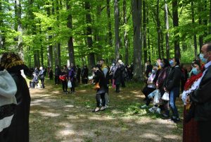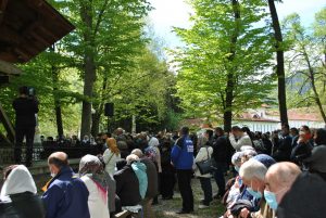 Oameni din nordul ţării, din judeţele din sud,  dar şi din împrejurimile Ţării Făgăraşului s-au aşezat în jurul altarului din pădure cu privirile aţintite spre soborul de preoţi. IPS Laurenţiu Streza, episcopul Ilarion Făgărăşeanul şi alţi zeci de preoţi  au  oficiat slujba.  Cei mai vârstnici enoriaşi mi-au vorbit despre părintele Arsenie Boca, amintindu-şi de sujbele pe care le săvârşea la altarul din pădure.   Era prin anii 1947-1948. Duminică de duminică altarul era înconjurat de mulţime multă dornică să-i asculte vorbele şi poveţele pline de duh.   ,,Unde sunt cei ce nu mai sunt” spunea Nichifor Crainic în poezia sa.   A răsunat pădurea când IPS Laurenţiu Streza a ieşit în faţa mulţimii spunând de trei ori ,,Hristos a Înviat”, urmat de troparul Învierii. A fost momentul când  pe feţele unora  erau lacrimi de bucurie, dezvăluind comuniunea cu Dumnezeu. Mitropolitul Laurenţiu Streza le-a vorbit apoi enoriaşilor în predica de la sfârşitul slujbei.  În altarul din pădure era rezervat locul pentru oficialităţi şi politicieni. Ca întotdeauna a fost prezent primarul comunei Sâmbăta de Sus,  Nicolae Morariu. Alături de el a participat la slujbă şi Adrian Veştea, preşedintele CJ Braşov. Şi comercianţii şi-au deschis tarabele cu suveniruri şi cu preparate  de tot felul. N-au lipsit nici persoanele care îţi cereau milostenie,  arătându-ţi handicapurile sau fotografii ale celor bolnavi.  Cel mai căutat punct din incinta mănăstirii a fost fântâna  unde  au fost montate robinete de la care oamenii îşi umpleau bidoanele cu apă. Aghiazma Mică a fost sfinţită încă de dimineaţă.  Sticle de 2 litri, de 5 litri, de 0,5 litri, fiecare cât a putut căra. Credincioşii s-au recules şi în biserica veche, ctitoria domnitorului Constantin Brâncoveanu, dar şi biserica nouă.