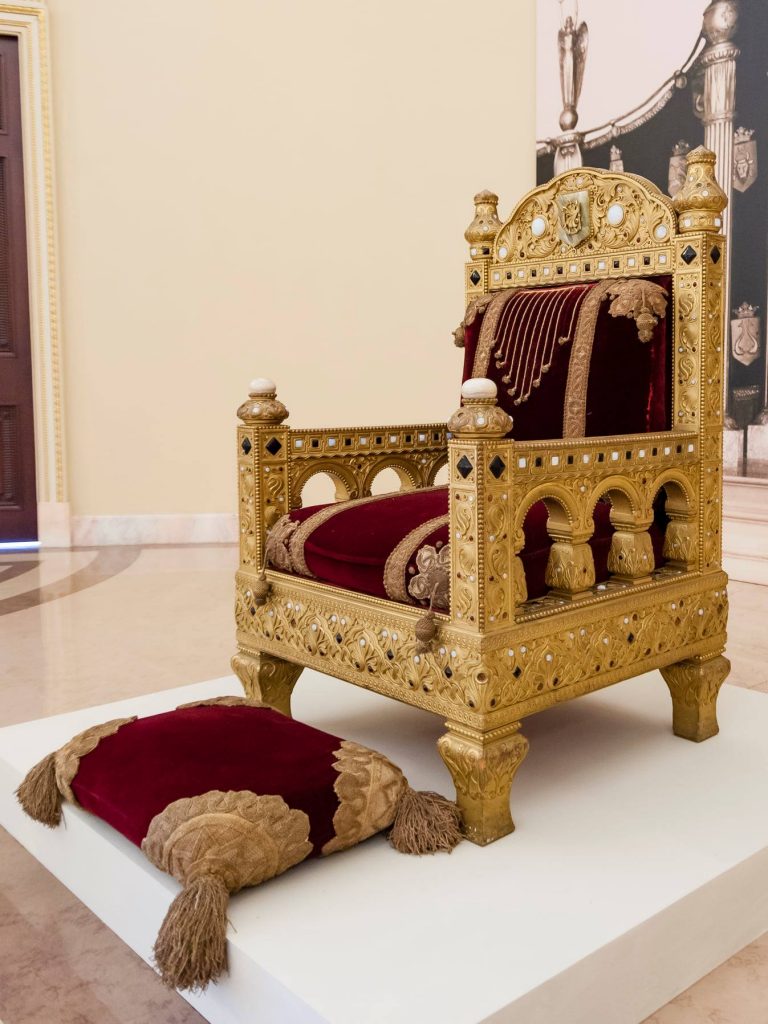 De Ziua Regalității, luni, 10 mai, Muzeul Național de Artă al României a deschis Sala Tronului unde a prezentat publiclui tronul Regelui Carol I al României, pentru prima dată după mai bine de 70 de ani. Piesa de mobilier a fost amplasată pe estrada de trei trepte, așa cum a fost întotdeauna tronul poziționat în Palatul Regal. Tronul și Spațiile Istorice, respectiv Sala Tronului, Sufrageria Regală și Scara Voievozilor auu putut vizitate gratuit luni, în intervalul orar 10.00 – 18.00. Odată ce România a fost proclamată Regat, au fost confecționate două tronuri, pentru cei doi suverani ai țării, Regele Carol I și Regina Elisabeta. Tronurile au fost confecționate din lemn aurit și ornate cu pietre prețioase, pe spătar fiind reprezentate cifrele cuplului regal – Carol I și Elisabeta, realizate în bronz poleit și aplicate pe plăci de onix algerian. Cele două tronuri au fost folisite între anii 1885 și 1947, de către toți monarhii României. După abdicarea Regelui Mihai I toate bunurile Casei Regale au fost transferate către diverse instituții din țară, tronul ajungând să fie expus în Salonul de Iarnă al conacului familiei Goleștilor – Muzeul Golești din judeșul Argeș.