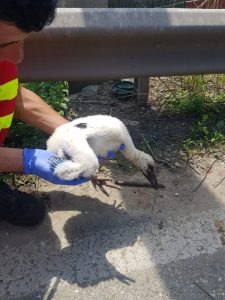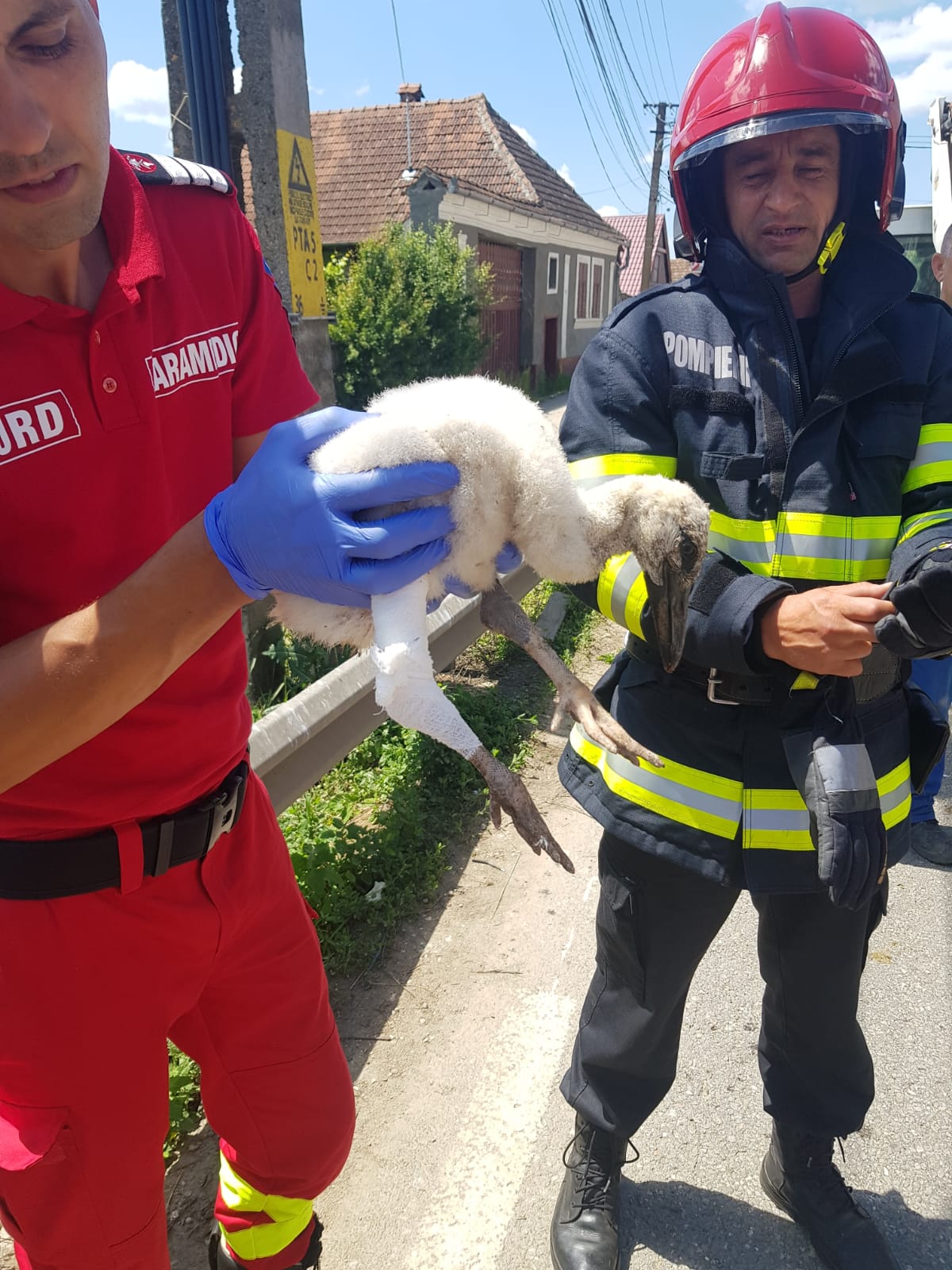 Un pui de barză a fost salvat de pompierii făgărăşeni după ce a căzut din cuib. Intervenţia Detaşamentului de Pompieri Făgăraş a avut loc în localitatea Părău luni, 7 iunie 2021, în jurul orelor 15.30.