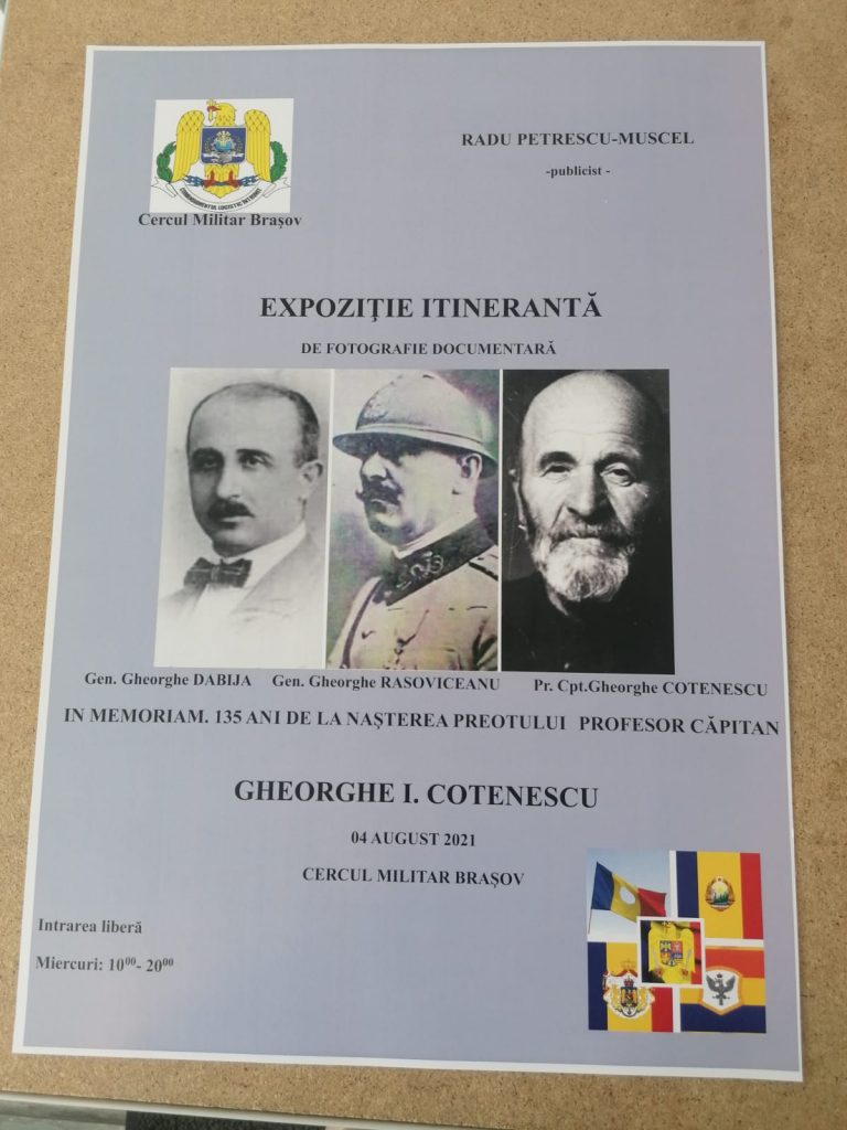 Miercuri, 4 august 2021, începând cu orele 10.00, va fi vernisată expoziţia foto-documentară itinerantă „135 de ani de la naşterea preotului-profesor căpitan dâmboviţeano-muscelean Gheorghe I. Cotenescu, mărturisitor în temniţele comuniste”. Manifestarea cultural-istorică este organizată de Cercul Militar Braşov (Casa Armatei), în parteneriat cu publicistul Radu Petrescu-Muscel, în calitate de iniţiator şi curator. Proiectul expoziţional a fost vernisat începând din iulie 2020, fiind prezent pe simezele insituţiilor culturale publice din localităţile Bucureşti, Câmpulung Muscel, Curtea de Argeş, Iaşi, Oradea, Piteşti, Râmnicu Vâlcea şi Galaţi. Această expoziţie memorial oferă braşovenilor posibilitatea cunoaşteri misiunii jertfelnice desfăşurate în secolul trecut de un model de preot cărturar a cărui viaţă exemplară consemnează şi cunoaşterea unor personaje cu rol însemnat în istoria Braşovului precum destoinicul părinte protopop Vasile Saftu, legendarul dr. Amos Frâncu şi enigmaticul student Ilie Cătărău. Fişa biografică a Preotului profesor căpitan Gheorghe I. Cotenescu este inclusă în peste 10 enciclopedii şi dicţionare, iar Consiliile Locale ale unor localităţi din 3 judeţe diferite i-au acordat titlul simbolic de Cetăţean de Onoare Post-Mortem (jud. Argeş: Mun. Câmpulung Muscel şi Com. Stoeneşti; jud. Bihor: Mun. Beiuş; jud. Iaşi: Mun. Iaşi). Intrarea la eveniment este liberă. (Petrescu-Cotenescu Ion-Gheorghe-Radu (pseudonim literar Radu Petrescu-Muscel) coordonatorul Centrului de Cercetări Istorice „Preotul Gheorghe I. Cotenescu”, membru UZPR, AFDPR, AUPRCR, ANCE “Regina Maria”, SSIR, ARIP, INGH „Sever Zotta”, Fundaţia Culturală “Memoria“)