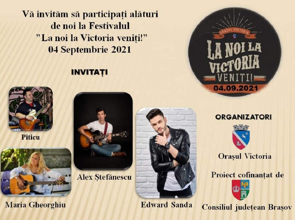 În perioada 4 – 6 septembrie a.c., oraşul Victoria va fi în sărbătoare, când Primăria şi CL Victoria organizează ,,Zilele oraşului Victoria’. În aceeaşi perioadă se va organiza şi festivalul ,,La noi la Victoria veniţi!”, cofinanţat de Consiliul Judeţean Braşov.