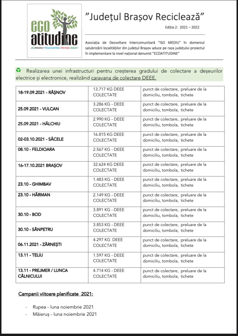 În cadrul campaniei „Județul Brașov Reciclează”, derulată de către Asociația de Dezvoltare Comunitară ISO Mediu (din care fac parte toate primăriile din județ), în cadrul proiectului „Ecoatitudine”, în mai multe localități din Brașov au fost derulate acțiuni de colectare a deșeurilor de echipamente electrice și electrocasnice. Prin aceste acțiuni, ISO Mediu și-a propus să creeze infrastructura necesară colectării acestui tip de deșeuri, astfel încât să fie reciclat responsabil și să nu ducă la poluarea mediului înconjurător.