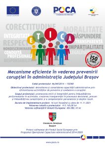 În perioada 11.11.2021 – 11.03.2023 CJ  Brașov implementează proiectul „Mecanisme eficiente în vederea prevenirii corupției în administrația Județului Brașov”,  Sprijinirea măsurilor referitoare la prevenirea corupției la nivelul autorităților și instituțiilor publice locale, în cadrul Programului Operațional Capacitate Administrativă (POCA).  Obiectivul general al proiectului îl reprezintă dezvoltarea și consolidarea capacității administrative prin eficientizarea activităților de prevenire și combatere a corupției. Proiectul are drept scop promovarea eticii și integrității pentru îmbunătățirea performanțelor în activitate, creșterea transparenței în procesului decizional, precum și îmbunătățirea cunoștințelor și a competențelor personalului și aleșilor locali. Proiectul se derulează încă din noiembrie 2021 şi are ca dată de finalizare  11.03.2023. Valoarea totală a proiectului este de  413.145,00 lei din care  cofinanțarea  Uniunii Europene este 404.882,10 lei.