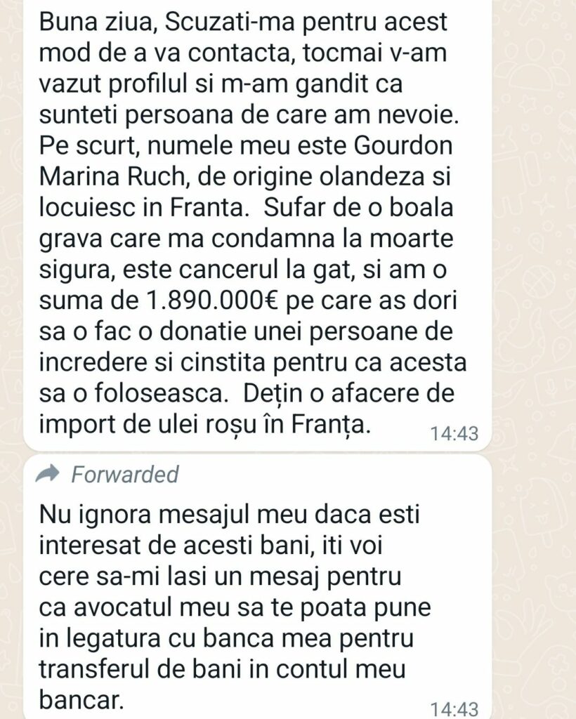 Este vorba despre mesaje nesolicitate primite pe WhatsApp, de obicei redistribuite, prin care oamenii sunt anunțați că urmează să primească o donație de aproximativ 1,9 milioane de euro. Desigur, totul este o tentativă destul de clară de a păcăli utilizatorul, o reinterpretare oferită celebrei ţepe care datează de la începutul internetului – scrisoarea sosită de la un prinț nigerian, care oferea un scenariu similar. Atunci, una dintre cele mai vechi scam-uri de pe internet se propaga prin e-mail. Deși are un grad de complexitate destul de redus, metoda încă este eficientă în unele cazuri și atrage în plasă utilizatori creduli. În 2019, CNBC anunța că o astfel de metodă încă genera câștiguri anuale de peste 700.000 de dolari, spune sursa Citată. Directoratul Național de Securitate Cibernetică avertizează că aceste tentative de fraudă se bazează pe câștigarea încrederii potențialei victime, căreia i se cere o sumă de bani în avans, pentru că ar urma să primească în schimb o adevărată avere. Ulteior, evident, banii promiși nu ajung la victimă. Specialiștii îi avertizează pe cei care primesc astfel de mesaje să evite interacțiunea în cazul unor astfel de situații și sub nicio formă să nu le ofere celor care le scriu bani ori date personale, date de autentificare sau date de card.