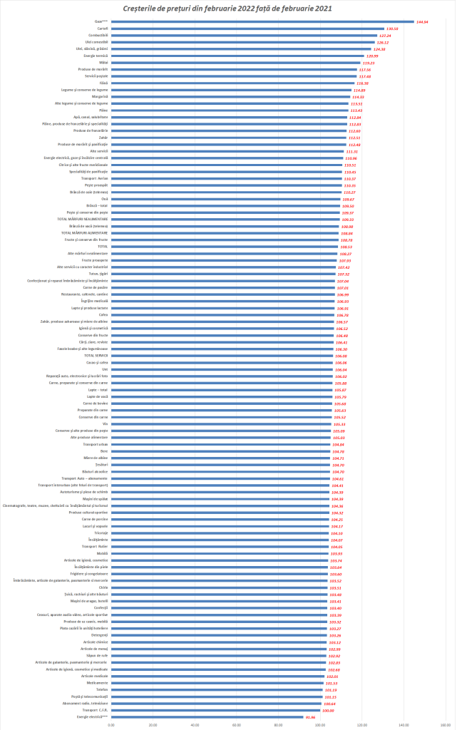 “Preţurile de consum în luna februarie 2022 comparativ cu luna ianuarie 2022 au crescut cu 0,6%. Rata inflaţiei de la începutul anului (februarie 2022 comparativ cu decembrie 2021) este 2,1%. Rata anuală a inflaţiei în luna februarie 2022 comparativ cu luna februarie 2021 este 8,5%. Rata medie a preţurilor de consum în ultimele 12 luni (martie 2021 – februarie 2022) faţă de precedentele 12 luni (martie 2020 – februarie 2021) este 6,0%”, arată datele INS.
