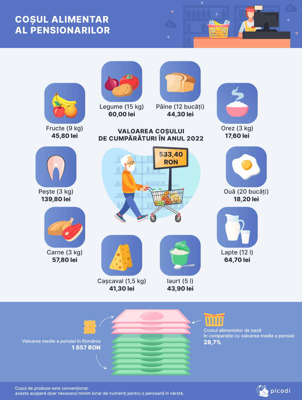 Valoarea coşului de produse alimentare de bază în martie 2022 este de 533,40 lei. Astfel, alimentele de bază care asigură doar supravieţuirea reprezintă echivalentul a 28,7% din valoarea medie a pensiei din România.