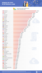 Dintre cele 44 de ţări luate în considerare, persoanele care trăiesc în Norvegia primesc cele mai mari pensii – 1 797 de euro pe lună, conform celor mai recente statistici oficiale. Elveţia (1.704 euro) şi SUA (1.482 euro) se disting, de asemenea, prin pensia de stat ridicată.   În România, conform celor mai recente date ale Institutului Naţional de Statistică, în jur de 4 milioane de persoane primesc pensii, iar pensia medie este de 1857 RON net sau 376 de euro (locul 28 în clasament).