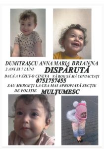 • „Vă rog din suflet ajutaţi-mă să vadă cât mai multă lume poza cu fetiţa mea şi poate o recunoaşte cineva pe stradă sau Poliţia Română se mobilizează şi face ceva să-mi găsească fetiţa! Sunt disperată şi foarte îngrijorată pentru că nu ştiu unde este copilul meu, nu ştiu în ce condiţii trăieşte, dacă este sănătoasă sau nu şi îmi este teamă că tatăl, în fuga lui de a se ascunde de autorităţi, să nu îi pună viaţa în pericol!”, este apelul unei mame îndurerate şi disperate să-şi găsească fetiţa.