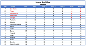 Conform EBU, „în cea de-a doua semifinală, s-a observat că patru dintre cele şase jurii au plasat toate cinci dintre celelalte ţări în Topul lor cinci (ţinând cont că nu au putut vota pentru ei înşişi); un juriu a votat pentru aceleaşi cinci ţări în Top 6; iar ultimul dintre cele şase jurii a plasat patru dintre celelalte ţări în Top 4 şi pe a cincea în Top 7”.