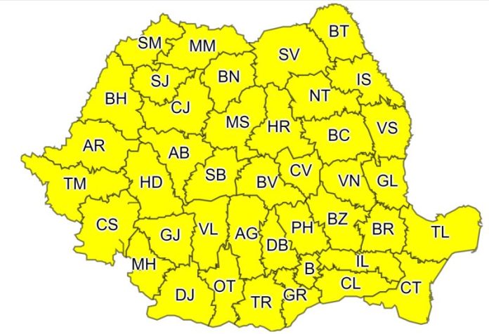 Avertizare meteo, Cod Galben pentru toată țara: Averse torențiale, descărcări electrice, vijelii și grindină