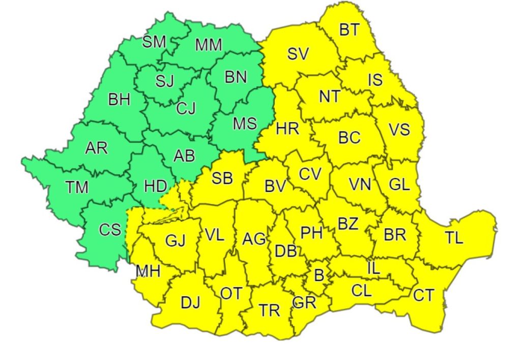 Indicele temperatură-umezeală (ITU) va atinge pragul critic de 80 de unități al disconfortului termic în sudul Olteniei, sudul și estul Munteniei, vestul Dobrogei și în extremitatea sudică a Moldovei.
