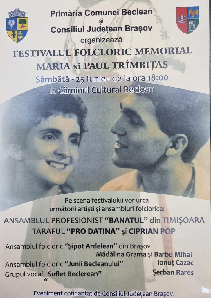 Primăria Comunei Beclean împreună cu Consiliul Județean Brașov organizează ”Festivalul de folclor MARIA ȘI PAUL TRÎMBIȚAȘ” sâmbătă, 25 iunie, de la ora 17.00 la Căminul Cultural Beclean.