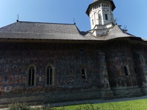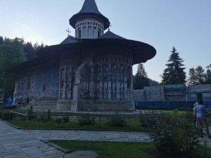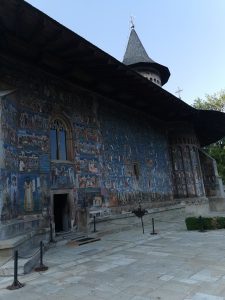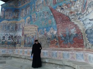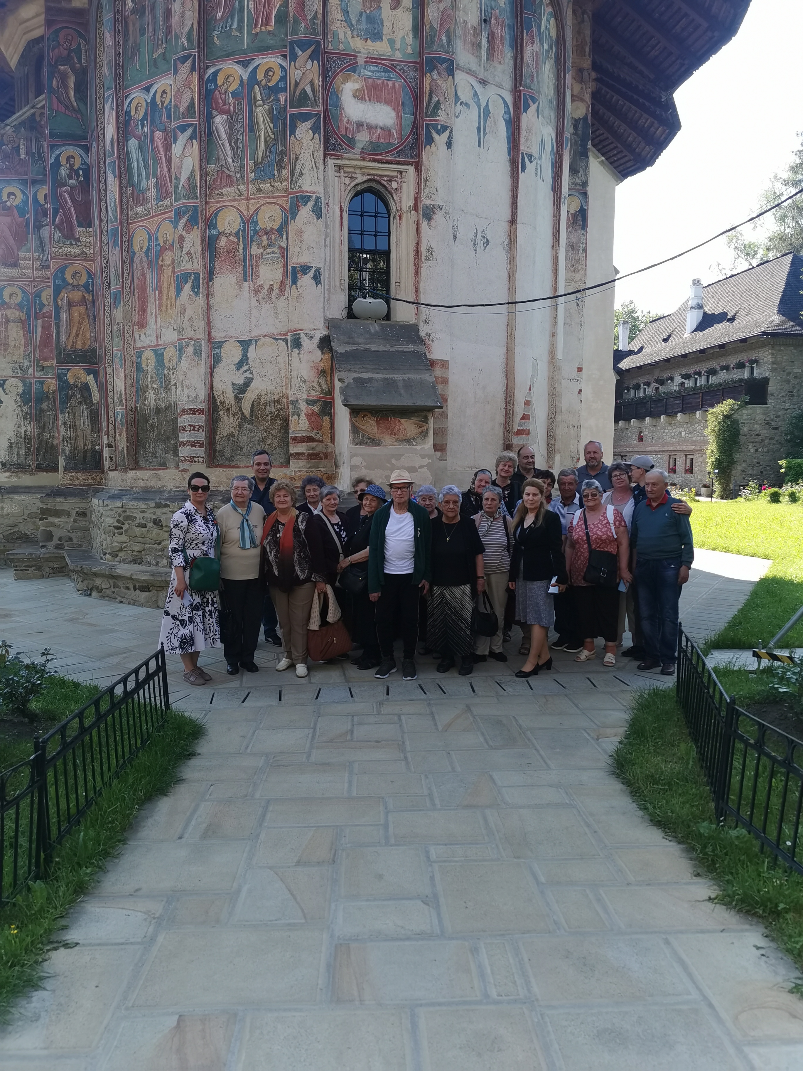 Mănăstirea Voroneț este una dintre cele mai frumoase mănăstiri din Bucovina, fiind inclusă în Patrimoniul UNESCO din România. Numită și “Capela Sixtină a Estului”, Mănăstirea Voroneț impresionează prin picturile sale cu totul deosebite. Am fost așteptați de monaha Elena Simionovici, autoarea volumului „Bucuria călătoriilor de suflet” (2017) tradus în 7 limbi, care ne-a prezentat edificiul de cult cu istoria și legendele sale. Mănăstirea constituie una dintre cele mai valoroase ctitorii ale lui Ștefan cel Mare, ca semn de mulțumire pustnicului Daniil Sihastru. După înfrângerea de la Războieni din 1476, Ștefan   cere sfatul pustnicului dacă să continue sau nu lupta. Daniil Sihastrul l-a sfătuit să continue luptele cu turcii, prevăzând că va birui, ceea ce s-a și întâmplat. În amintirea acestei victorii, domnitorul a construit Mănăstirea Voroneț. Este construită cu ajutorul soldaților și are un aspect interesant   dat de acoperișul de șindrilă care are formă de cort.  Încă din timpul domniei lui Ștefan cel Mare, dar și după anul 1488, mănăstirea a devenit un important centru de credință și cultură din Moldova medievală. În anul 1547 vărul lui Petru Rareș, Grigore Roșca, construiește pridvorul închis de la vest pe peretele căruia este pictată, celebra Judecată de Apoi de la Mănăstirea Voroneț. Maica Elena ne-a explicat cu răbdare și pe înțelesul fiecăruia simbolul acestei scene cuprinsă în  Apocalipsa Bibliei. În 1785, Mănăstirea Voroneț se găseşte printre cele 23 de mănăstiri desfiinţate după anexarea părţii de nord a Moldovei Imperiului, când călugării au fost siliţi să-şi părăsească Mănăstirea, chiliile lor ajungând treptat ruine. Foştii lucrători pe pământurile Mănăstirii au format satul Voroneţ, iar biserica a fost folosită la oficierea slujbelor pentru aceşti credincioşi.  Pictura exterioară a Voronețului, datând din timpul domniei lui Petru Rareș, este realizată la un înalt nivel artistic, fiind socotită drept cel mai reușit ansamblu al artei feudale moldovenești. Albastrul de Voroneț, care nu a mai putut fi reprodus, este unic în lume. Biserica însă e mai mult de atât, este o adevărată Biblie în imagini și totodată “Capela Sixtină a Orientului”, spune maica Elena.  Pictura interioară a bisericii datează în cea mai mare parte din timpul lui Ștefan cel Mare, anul 1496.  În interiorul bisericii rețin atenția: jilțurile și stranele din secolul al XVI-lea, un jilț domnesc,  mormântul mitropolitului Grigore Roșca, din pridvor, mormântul sihastrului Daniil (Daniil Sihastrul), din pronaos. Legenda spune că Mănăstirea Voroneț a fost înălţată de Ştefan cel Mare între 26 mai şi 14 septembrie 1488, în doar 3 luni,  la sfatul dat domnitorului de către Daniil Sihastru. În anii trecuți, Octav Bjoza, președintele AFDPR, ne-a recitat balada, autor necunoscut, legată de dialogul dintre domnitor și sfetnicul său.  La Mănăstirea Voroneţ şi-a petrecut Daniil Sihastrul ultimii 26 de ani din viaţă. Pustnicul a murit în 1496 şi a fost îngropat în biserica Mănăstirii Voroneţ. A fost canonizat în 1992 şi a devenit Sfântul Cuvios Daniil Sihastrul.