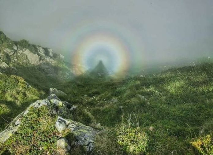O imagine spectaculoasă, aproape ireală, a devenit virală duminică pe Facebook, după ce a fost postată pe pagina Meteo Plus. Fotografia surprinde un fenomen meteo foarte rar, Efectul Gloria. Fotografia a fost făcută de fotograful Dani Ursache și publicată, de asemenea, pe profilul Dany Photography. Acesta se afla în apropiere de Lacul Avrig, aflat la 2011 metri altitudine, în partea de vest a masivului Făgăraş. „Efectul Gloria mai poarta numele de „Spectru montan” ori „Spectru Brocken”. Umbra observatorului este proiectată pe ceată, vorbim de o iluzie optică. Picăturile minuscule de apă reflectă lumina soarelui înapoi către acesta, formând un nimb colorat în jurul umbrei” explică specialiștii.