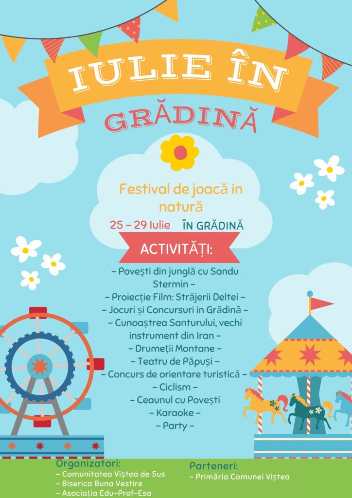Între 25 și 29 iulie, în Viștea de Sus, va avea loc festivalul de joacă în natură “Iulie în grădină”, ce se anunță a fi un marathon de zâmbete, jocuri, concursuri, drumeții, povești, teatru și film. Cuvântul cheie al primei zile este aventura. Exploratori mici și mari sunt provocați la o drumeție pe Valea Sâmbetei, unde îi așteaptă un picnic authentic montan și delicioase bezele fripte pe băț.