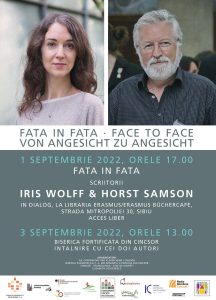 - ora 13:00: Scriitorii Iris Wolff și Horst Samson în dialog – întâlnire cu cei doi autori la biserica fortificată din Cincșor;