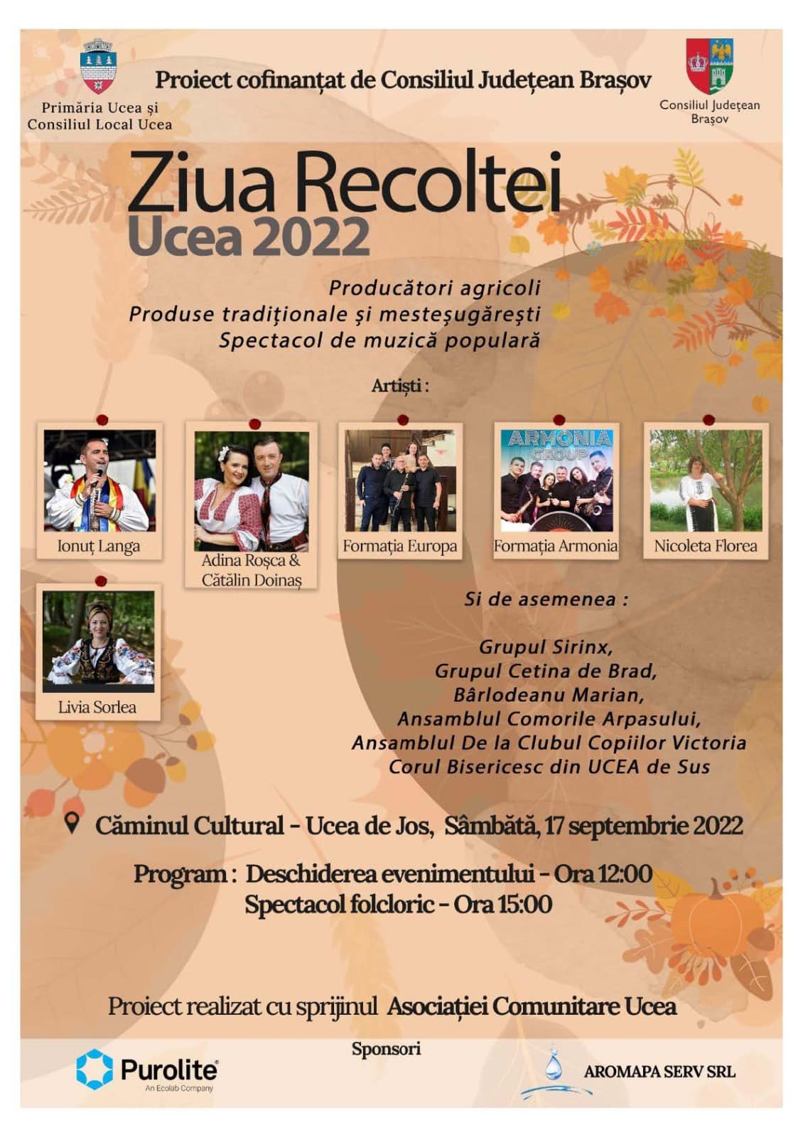 Vor urca pe scenă artiștii de muzică populară: Ionuț Langa, Adina Roșca și Cătălin Doinaș, Nicolata Florea, Livia Sorlea. Spectacolul va continua cu formațiile Armonia, Europa, Grupul Sirinx, Grupul Cetina de Brad, Bârlădeanu Marian, Ansamblul Comorile Arpașului, Ansamblul de la Clubul Copiilor Victoria și Corul Bisericesc din Ucea de Sus.   Ziua Recoltei este un proiect realizat de Comua  Ucea cu sprijinul Asociației Comunitare Ucea, cofinanțat de Consiliul Județean Brașov. S-au alăturat proiectului sponsorii Aromapa Serv Ucea și Purolite.