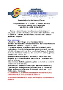 Primăria Părău își anunță cetățenii că începând cu data de 17 octombrie 2022 se pot depune cereri pentru acordarea ajutorului de încălzire.  Sunt eligibile, conform Legii nr. 226/2021, persoanele care au un venit mediu net lunar pe membru de familie de până la 1386 lei, inclusiv, sau până la 2053 lei pentru o singură persoană.