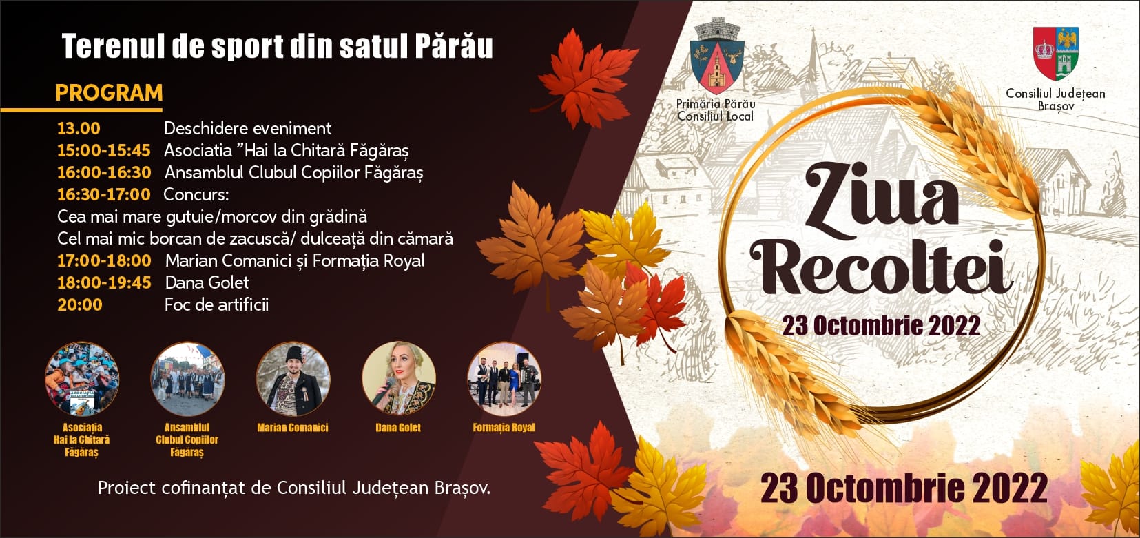 Localitatea Părău va fi în sărbătoare duminică, 23 octombrie a.c., cu ocazia organizării ,,Zilei Recoltei“. După slujba de la biserică, sătenii sunt așteptați la terenul de sport din sat unde la ora 13.00 va avea loc deschiderea evenimentului. Pe scena amplasată pe teren vor evolua artiști și formații artistice:  Asociația ,,Hai la chitară“ din Făgăraș, Ansamblul Clubul Copiilor Făgăraș, Formația Royal, Marian Comanici, Dana Goleț.  Vor fi premiate cele mai bune preparate în cadrul concursurilor: