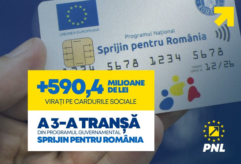 Luni, 24 octombrie 2022, Ministerul Investițiilor și Proiectelor Europene a încărcat o nouă tranșă de 250 de lei, cea de-a III-a, pe cardurile sociale oferite prin programul „Sprijin pentru România” Valoarea totală a tranșei III se ridică la peste 590 de milioane de lei și a ajuns la aproximativ 2,4 milioane de români.