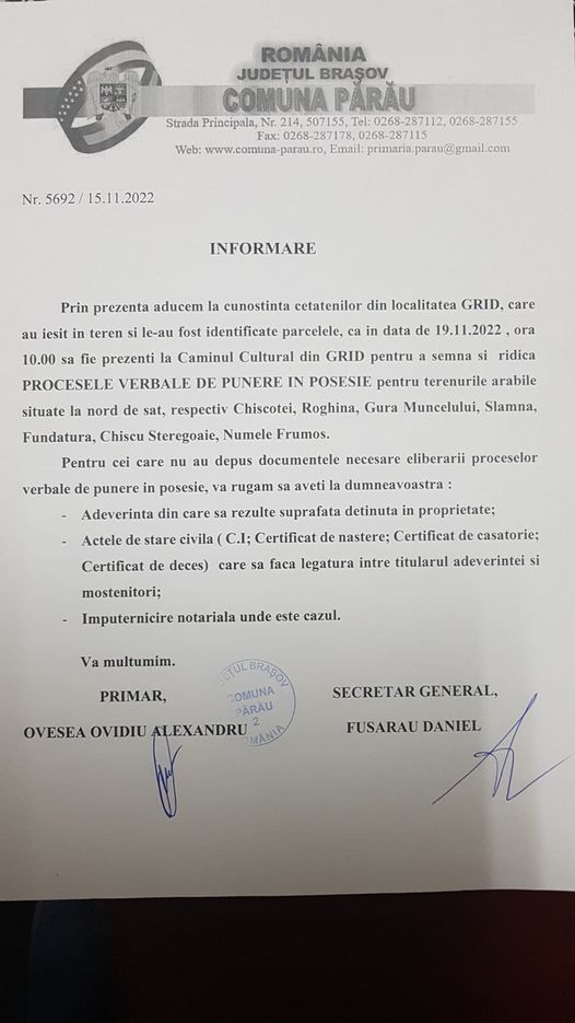 Cetățenii   din localitatea Grid sunt convocați de Primăria Părău pentru data de 19 noiembrie 2022, ora 10.00, la Căminul Cultural Grid pentru a semna și ridica Procesele verbale de punere în posesie pentru terenurile arabile.
