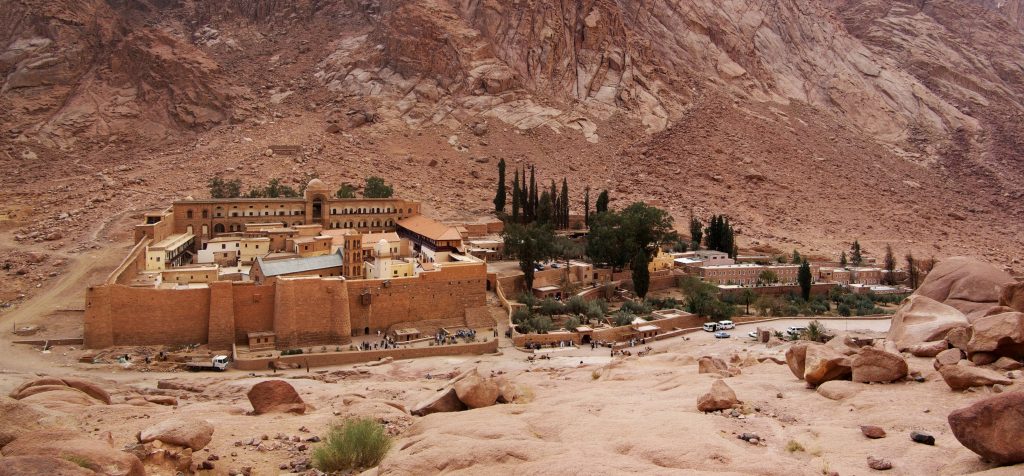 Muntele Sinai cu vîrful cunoscut cu numele Jabal Musa, care se traduce Muntele lui Moise, are o înălţime de 2.285 m şi se ridică la capătul de sud al peninsulei Sinai. Cercetarea muntelui în privinţa legăturii cu Moise a început în vremea împăratului Constantin, în sec. al IV-lea, la peste 1500 de ani de la evenimentele descrise în Cartea Plecării din Vechiul Testament. Primii creştini egipteni au fost copţii, iar mărturii ale existenţei lor, aşa cum ne spune ghidul egiptean care vorbeşte foarte bine limba română, sînt cîteva mănăstiri ce pot fi vizitate şi astăzi. Mănăstirea Sfînta Nina de lîngă Alexandria, cea mai mare mănăstire creştină unde se găsesc şi moaştele întregi ale sfintei. Mănăstirea Sf. Macarie cel Mare Egiptean, mănăstirea Sf. Paisie. Cea mai veche este însă Mănăstirea Sf. Antonio cel Mare, părintele monarhismului, unde sînt adăpostite moaştele întregi ale sfîntului, şi se află lîngă Cairo. Mai sînt Mănăstirea Sf. Pavel Tedeul, amenjată într-o peşteră, şi mănăstirea ortodoxă Sfinta Ecaterina, administrată de călugări greci, unde se găsesc părţi din moaştele sfintei.