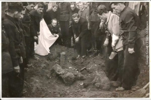 Ajunși la putere pentru scurtă vreme alături de Ion Antonescu, în toamna lui 1940, legionarii aveau să purceadă la deshumarea lui Corneliu Codreanu. Operațiunea a durat zile și nopți la rînd, participând sute de oameni care au lucrat, în schimburi, 24 de ore din 24, ca urmare a dificultății înlăturării uriașei plăci de beton. În noaptea de 27 noiembrie 1940, săpătorii ajung la rămășițele pământești ale celor uciși. Un amplu reportaj din ziarul Evenimentul zilei, din 28 noiembrie 1940, relatează: