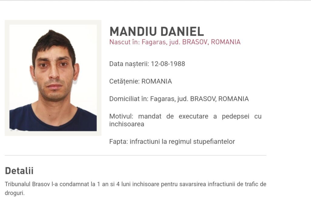 Un bărbat din Făgăraș este căutat de polițiști pentru infracțiuni la regimul stupefiantelor. Pe numele lui există mandat de arestare, apărând pe lista persoanelor urmărite publicată pe site-ul Poliției Române. Tribunalul Brașov l-a condamnat la 1 an și 4 luni de închisoare pentru săvàrșirea infracțiunii de trafic de droguri. Bărbatul se numește Daniel Mandiu, are 34 de ani.