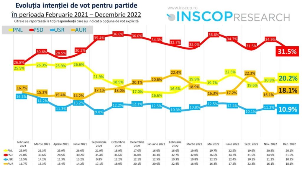 Potrivit studiului sociologic realizat în luna decembrie, PSD înregistra cel mai slab scor din acest an, 31,5% (cotă înregistrată și în septembrie), PNL – 20,2%, AUR – 18,1% și USR -10,9%. Toate partidele, cu excepția AUR, au scăzut față de luna precedentă.