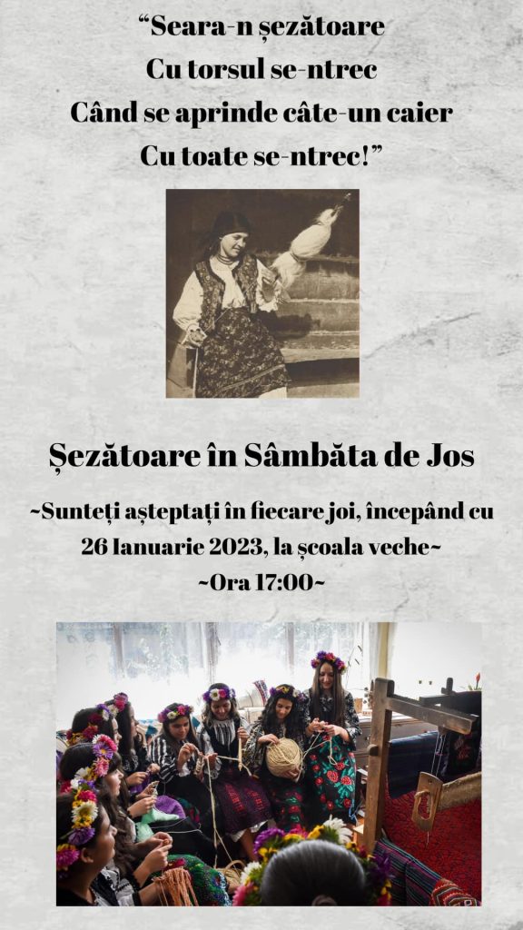 Comunitatea din Sâmbăta de Jos va organiza joi, 26 ianuarie 2023, începând cu ora 17.00, un eveniment cultural menit să reînvie un obicei vechi al satului făgărășean, șezătoarea. Asociația ,,Clubul Sâmbetenilor“, invită iubitorii de tradiții la Șezătoarea care va fi organizată în școala veche a satului.