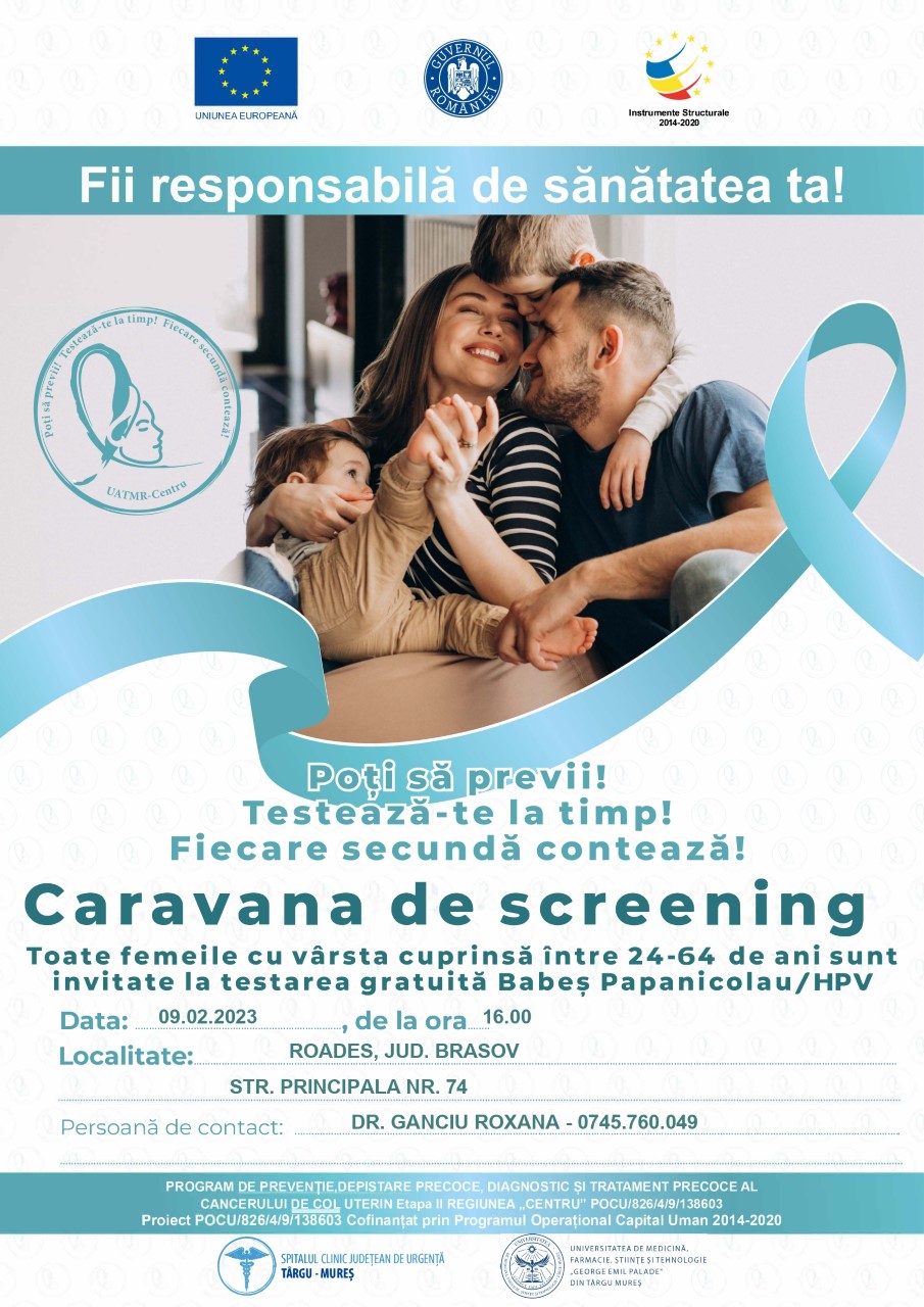 Caravana mobilă pentru screeningul cancerului de col uterin se va afla în această perioadă în județul Brașov, iar  joi, 9 februarie, va fi în localitatea Roadeş, comuna Buneşti. Femeile cu vârsta între 24-64 de ani sunt aşteptate să participe la screeningul cancerului de col uterin, prin testare gratuită Babeş-Papanicolaou şi HPV începând cu ora 16.00, pe str. Principală nr. 74. Acestea sunt rugate să aibă la ele cartea de identitate.