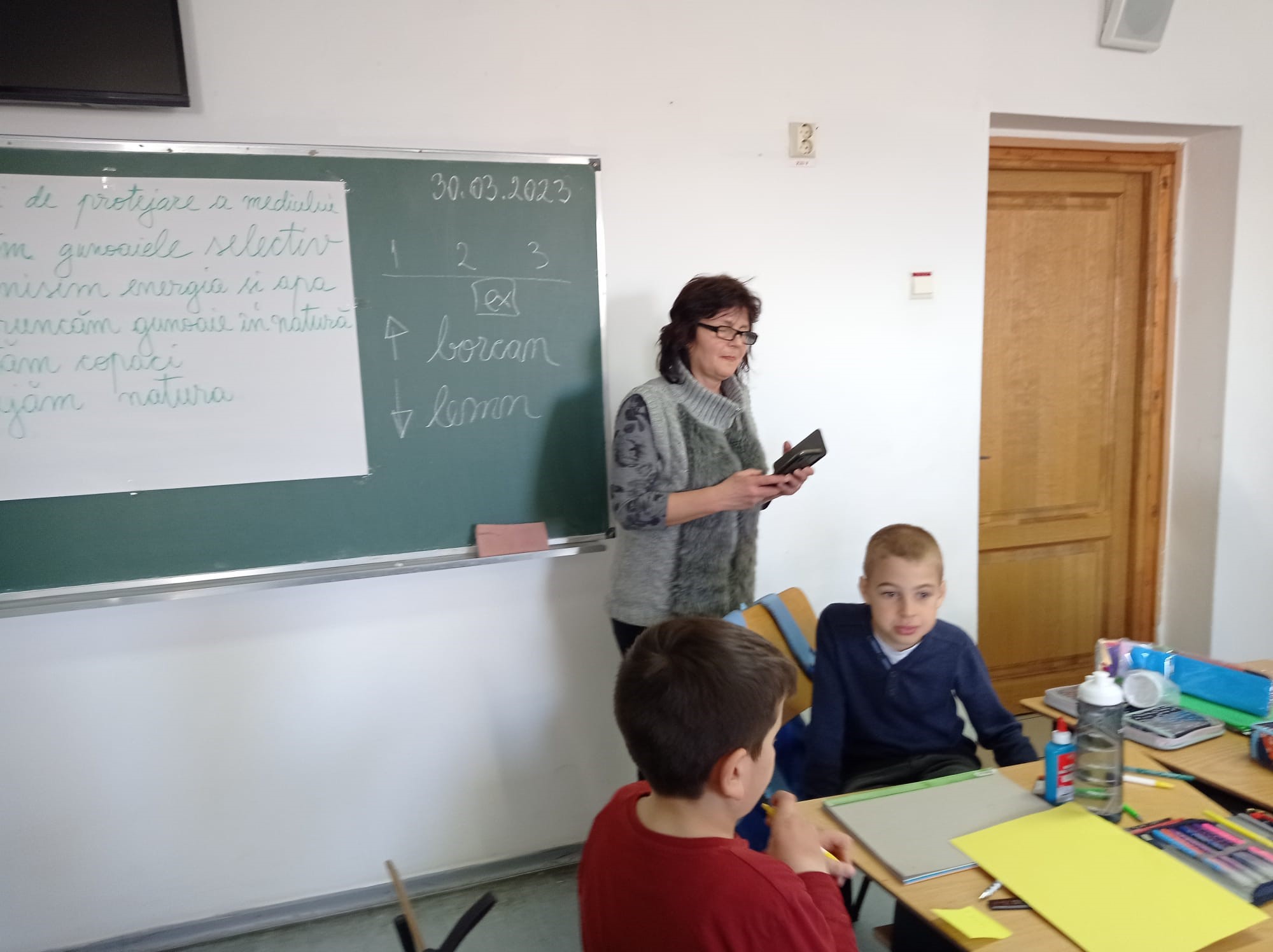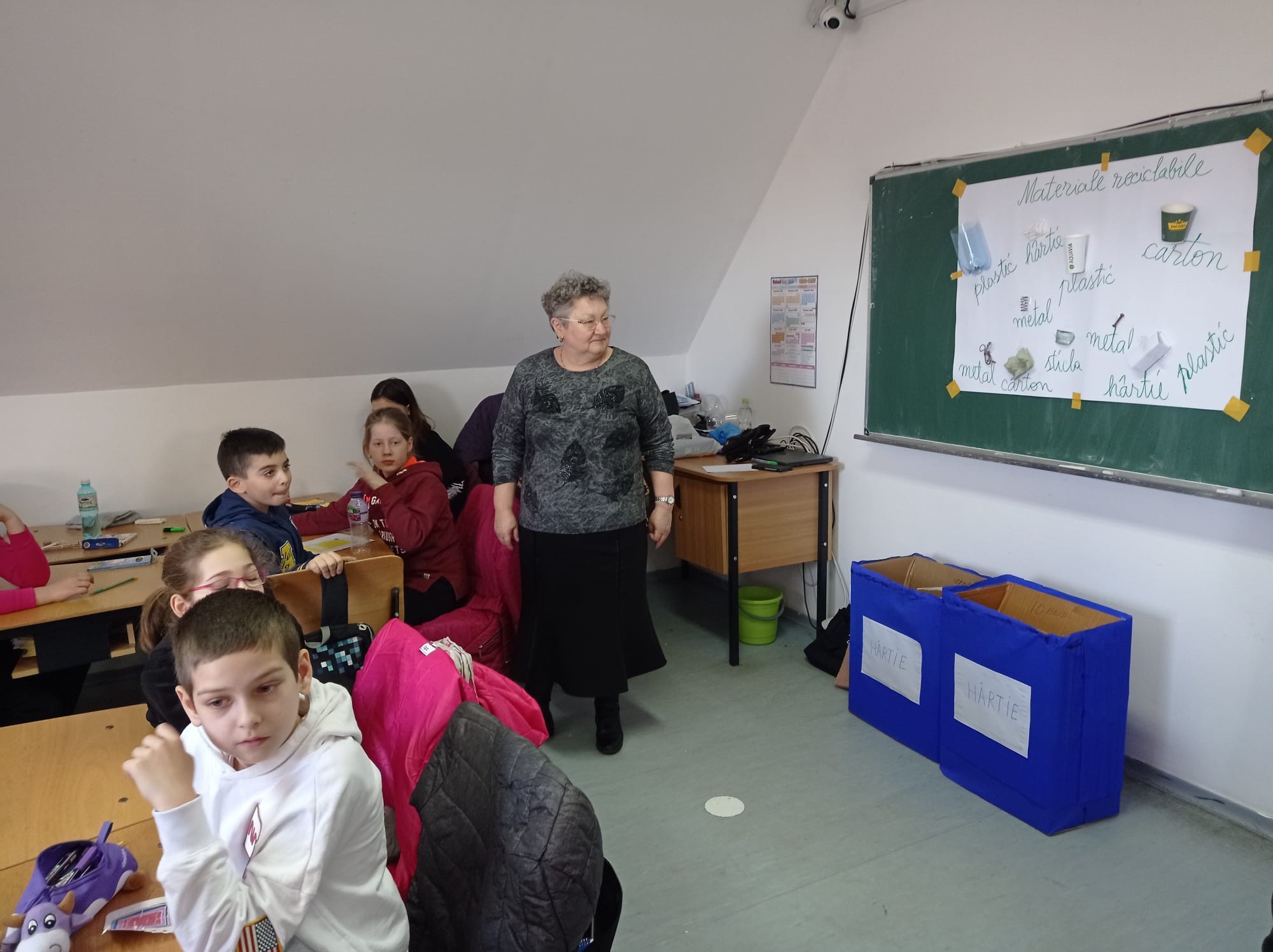 - ,,Tema activității de astăzi este plantarea semințelor unei plante. În fiecare zi am avut o altă temă, luni a fost realizarea unei machete ,,Orașul verde”. Elevii au confecționat căsuțe, copaci, vegetație. Marți am fost la un restaurant unde li s-au prezentat copiilor principiile unei alimentații sănătoase.. Miercuri am realizat, din materiale refolosibile, instrumente muzicale și am vizionat un material despre un cântăreț care cânta la frunze. Ziua de Vineri a fost selectată pentru un program de curățenie în curtea școlii și în parcul de lângă școală. Copiii au realizat obiecte foarte interesante din materiale reciclabile și au dovedit că pot pune în practică ceea ce au aflat pe parcursul activității” a spus Gabriela Cocan, profesoară la ciclul primar- Clasa Pregătitoare B.