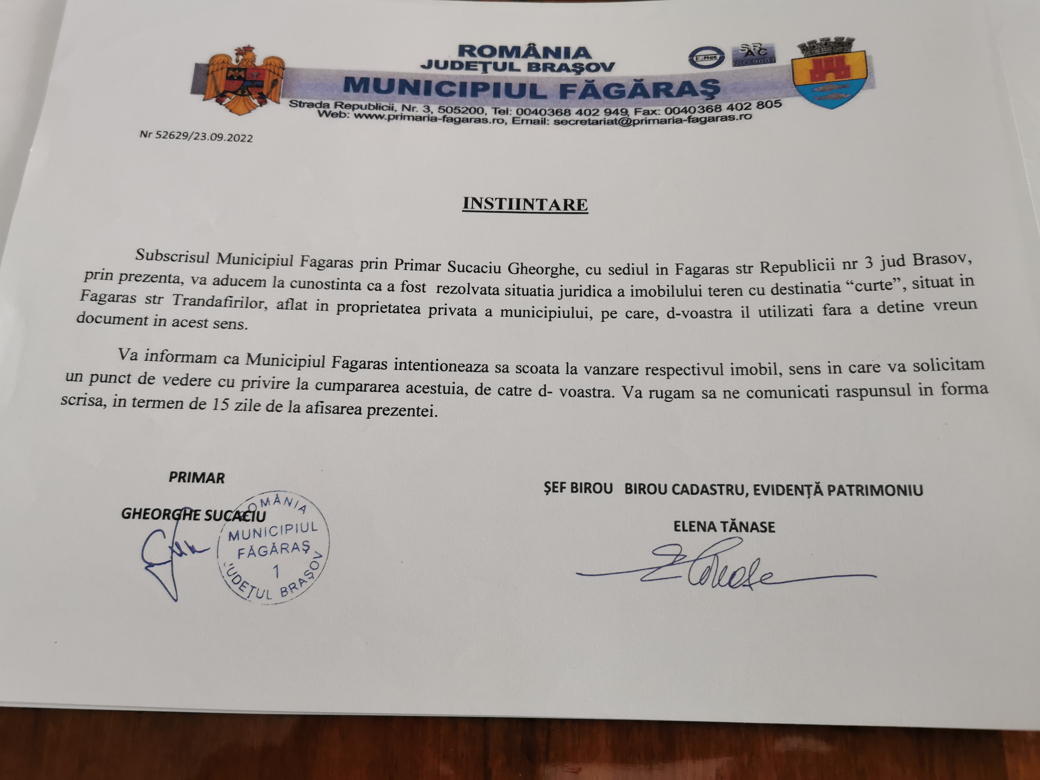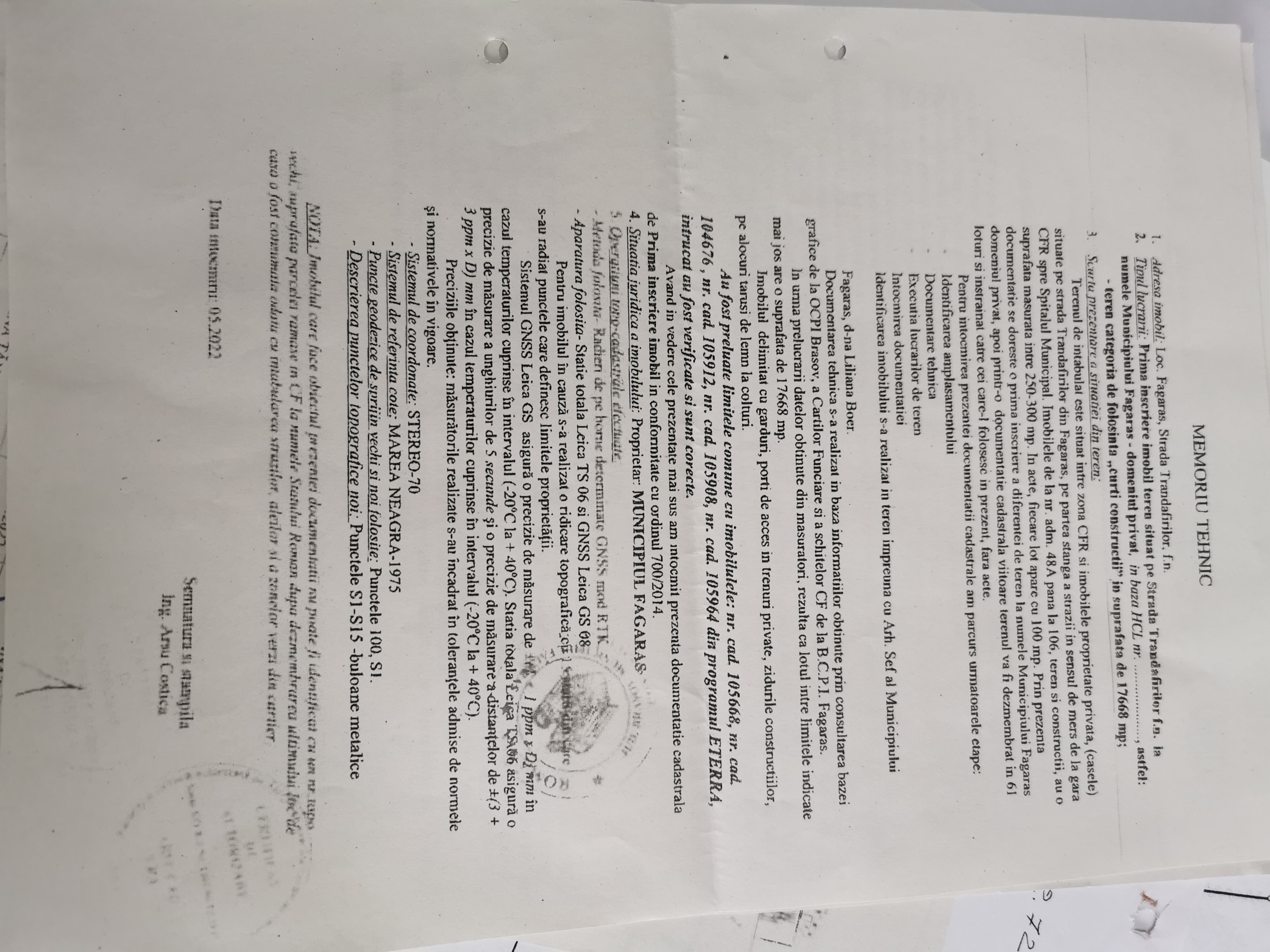 Memoriul tehnic întocmit de Arsu Cad prevede prima înscriere a imobilului teren situat în strada Trandafirilor în suprafață de 17. 668 mp, de la numărul administrativ 48A la 106, loturile, în număr de 61, urmând a fi vândute.   Ca  urmare a lucrării realizate de Arsu Cad SRL, s-a emis HCL nr. 197 din 26 mai 2022  care prevedea  însușirea documentației cadastrale, prima înscriere a terenului intravilan din Trandafirilor și  apartenența la domeniul privat al Municipiului Făgăraș ca fiind de uz și interes privat local. Tot în mai 2022, primarul Făgărașului emite niște adeverințe având și semnăturile arhitectului Liliana Boer și  șefului de la Biroul de cadastru, Elena Tănase, prin care se susține că terenul în suprafață de 17.668 mp se află în administrarea Municipiului Făgăraș și face obiectul documentației cadastrale întocmită de SC Arsu Cad SRL. În septembrie 2022, primarul trimite înștiințări proprietarilor din strada Trandafirilor prin care îi anunță că  pentru  imobilul teren cu destinația curte a fost rezolvată situația juridică și urmează să fie scos la vânzare. Totodată cerea proprietarilor să comunice Primăriei în scris, în termen de 15 zile, dacă vor să cumpere.