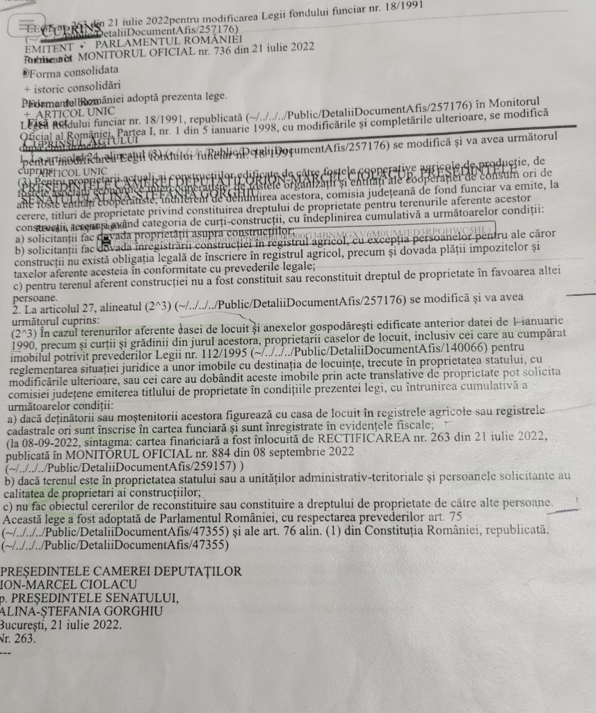 La articolul 27/2 se stipulează:  În cazul terenurilor aferente casei de locuit şi anexelor gospodăreşti edificate anterior datei de 1 ianuarie 1990, precum şi curţii şi grădinii din jurul acestora, proprietarii caselor de locuit, inclusiv cei care au cumpărat imobilul potrivit prevederilor Legii nr. 112/1995 pentru reglementarea situaţiei juridice a unor imobile cu destinaţia de locuinţe, trecute în proprietatea statului, cu modificările ulterioare, sau cei care au dobândit aceste imobile prin acte translative de proprietate pot solicita comisiei judeţene emiterea titlului de proprietate în condiţiile prezentei legi, cu întrunirea cumulativă a următoarelor condiţii: a)dacă deţinătorii sau moştenitorii acestora figurează cu casa de locuit în registrele agricole sau registrele cadastrale ori sunt înscrise în cartea financiară şi sunt înregistrate în evidenţele fisc; b)dacă terenul este în pale; roprietatea statului sau a unităţilor administrativ-teritoriale şi persoanele solicitante au calitatea de proprietari ai construcţiilor;c)nu fac obiectul cererilor de reconstituire sau constituire a dreptului de proprietate de către alte persoane.(Lucia BAKI)