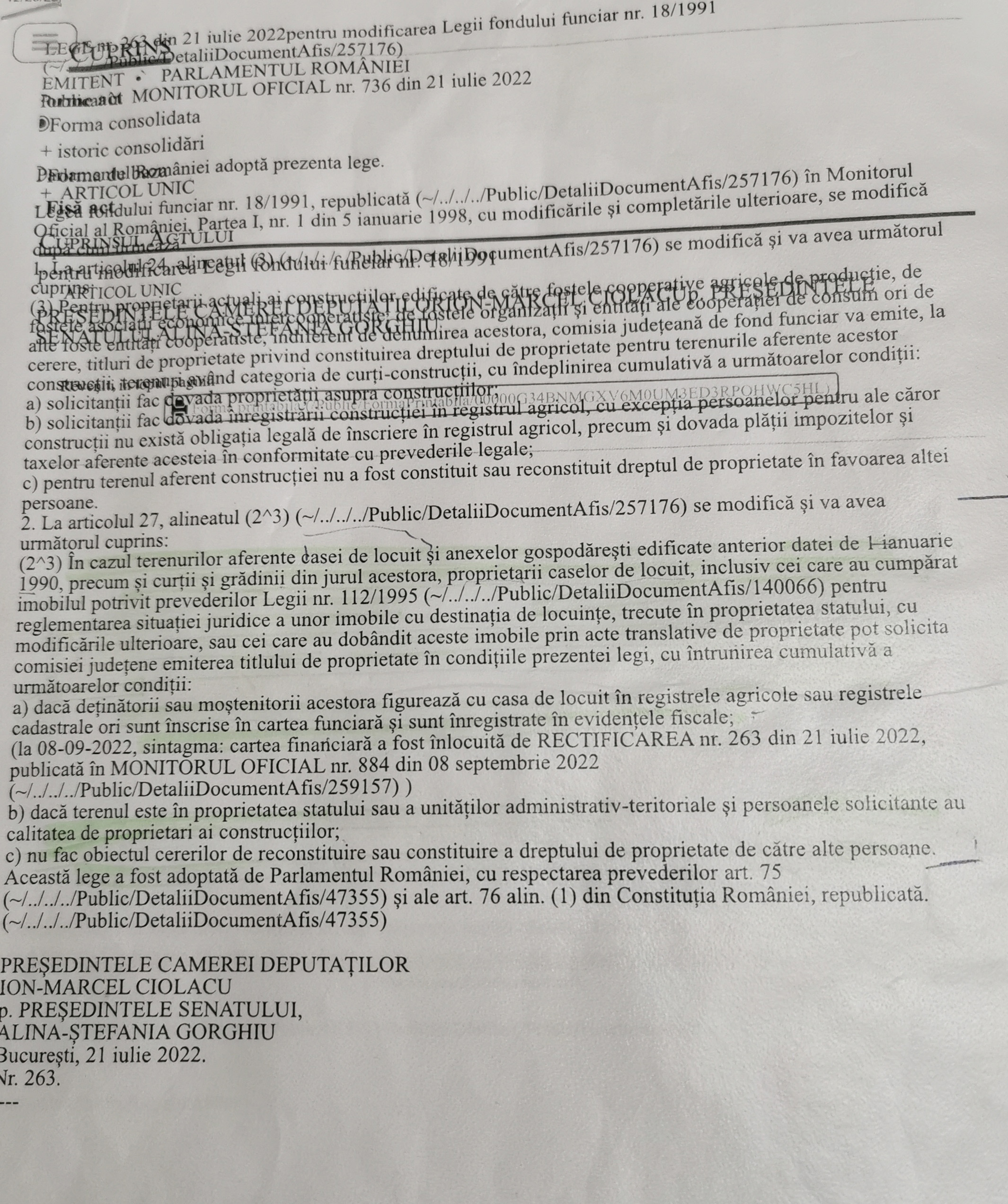 La articolul 27/2 se stipulează: În cazul terenurilor aferente casei de locuit şi anexelor gospodăreşti edificate anterior datei de 1 ianuarie 1990, precum şi curţii şi grădinii din jurul acestora, proprietarii caselor de locuit, inclusiv cei care au cumpărat imobilul potrivit prevederilor Legii nr. 112/1995 pentru reglementarea situaţiei juridice a unor imobile cu destinaţia de locuinţe, trecute în proprietatea statului, cu modificările ulterioare, sau cei care au dobândit aceste imobile prin acte translative de proprietate pot solicita comisiei judeţene emiterea titlului de proprietate în condiţiile prezentei legi, cu întrunirea cumulativă a următoarelor condiţii: a)dacă deţinătorii sau moştenitorii acestora figurează cu casa de locuit în registrele agricole sau registrele cadastrale ori sunt înscrise în cartea financiară şi sunt înregistrate în evidenţele fisc; b)dacă terenul este în pale; roprietatea statului sau a unităţilor administrativ-teritoriale şi persoanele solicitante au calitatea de proprietari ai construcţiilor;c)nu fac obiectul cererilor de reconstituire sau constituire a dreptului de proprietate de către alte persoane.” (Lucia BAKI)