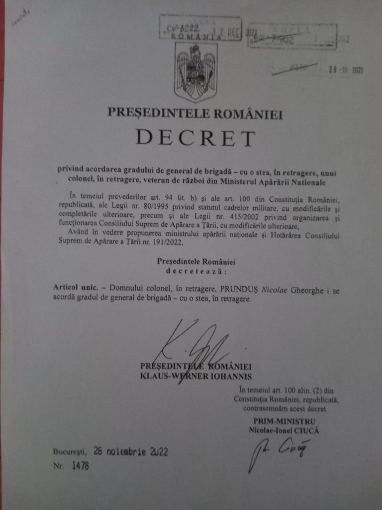 A trecut prin anii dureroși ai războiului, a înfruntat cu curaj gloanțele pe front, a supraviețuit regimului comunist și anchetelor securității și a format zeci de generații de elevi. A ajuns la frumoasa vârstă de 102 ani trecuți, o viață pusă în slujba țării și a semenilor. Gheorghe Prunduș este astăzi un bun exemplu pentru făgărășeni și nu numai. Și pentru că nu are cum să-și uite camarazii de luptă, în fiecare an este prezent la  Monumentul eroilor din Făgăraş unde depune o coroană de flori  în memoria eroilor  căzuți în lupte pentru libertatea și independența țării. Astăzi îşi priveşte decoraţiile, ,,Coroana României” şi ,,Steaua României” şi le poartă cu mândrie la evenimentele organizate în memoria eroilor români. În geamul casei așează drapelul țării în fiecare zi care marchează un eveniment istoric, iar în casă are un colț amenajat dedicat  istoriei țării și credinței strămoșești. Președintele României a acordat veteranului de război Gheorghe Prunduș gradul de general de brigadă cu o stea, în retragere, la propunerea ministrului Apărării Naținale și a Consiliului Suprem de Apărare a Țării. Decretul  a fost semnat de Președintele României la data de 26 noiembrie 2022. Generalul de brigadă cu o stea, în retragere, Prunduș Nicolae Gheorghe a primit, zilele trecute, vizita unei delegații  oficiale din cadrul Departamentului relația cu Parlamentul și calitatea vieții personalului, care, în cadrul programului ,,Acasă la Veterani“ i-a oferit  făgărășanului o ținută completă specifică gradului militar.