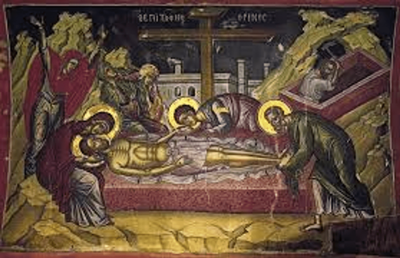 Mă uitam la ea. Era o adevărată Mater Dolorosa. Câtă umilință, câtă supunere și ascultare față de voia lui Dumnezeu! In același timp decență, demnitate și noblețe imperială. In necuprinsa- i durere sufletul ei plângea. Maria a vârât mâna pe sub ceafa Fiului, İ-a înălțat puțin capul, s-a aplecat și İ-a atins obrazul de-al ei, dându-İ sărutul sufletului, sărutul Ingerilor din Cer. Punându-I apoi capul, cu mare grijă, la loc s-a retras în colțul stàng al gropii, lângă Ioan, pe când Nicodim făcea ultimele pregătiri înaintea îngropăciunii. Eu priveam cu luare-aminte scena pe care o aveam în față: la fiecare colț al gropii era o Marie îndoliată” (Medicul grec, SOTIRIOS CROTOS)