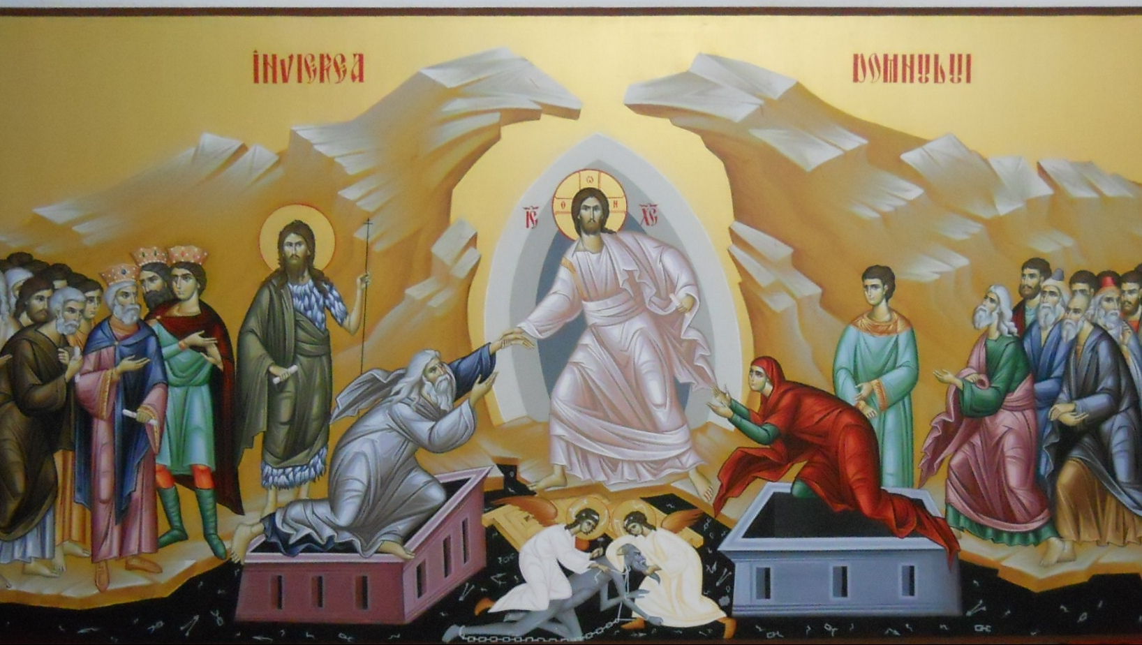 ,,Târziu, Sâmbătă noaptea, când se lumina de ziua întâia a săptămânii, a venit Maria Magdalena şi cealaltă Marie, ca să vadă mormântul. Şi iată s-a făcut cutremur mare, că îngerul Domnului pogorând din cer a venit, a rostogolit piatra şi a stat deasupra ei. Şi înfăţişarea lui era luminoasă ca fulgerul şi îmbrăcămintea lui era albă ca omătul. Şi de frica lui s-au cutremurat străjerii şi s-au făcut ca morţi. Iar îngerul vorbind femeilor le-a zis: «Nu vă temeţi voi, că ştiu că pe Iisus cel răstignit îl căutaţi. Nu este aici, că s-a sculat precum a zis; veniţi de vedeţi locul unde a zăcut. Duceţi-vă degrabă şi spuneţi ucenicilor Lui că s-a sculat din morţi şi iată merge înaintea voastră în Galileia; acolo îl veţi vedea. Iată v-am spus vouă». Iar ele au plecat în sârg de la mormânt şi cu frică şi cu bucurie mare au alergat ca să vestească pe ucenicii Lui. Dar când mergeau ca să vestească pe ucenici, iată Iisus le-a întâmpinat şi le-a zis: Bucuraţi-vă. Ci ele venind aproape au cuprins picioarele Lui şi s-au închinat Lui. Atunci Iisus le-a zis: Nu vă temeţi. Duceţi-vă şi daţi de veste fraţilor mei, ca să meargă în Galileia, şi acolo Mă vor vedea“. (Matei 28, 1-10)