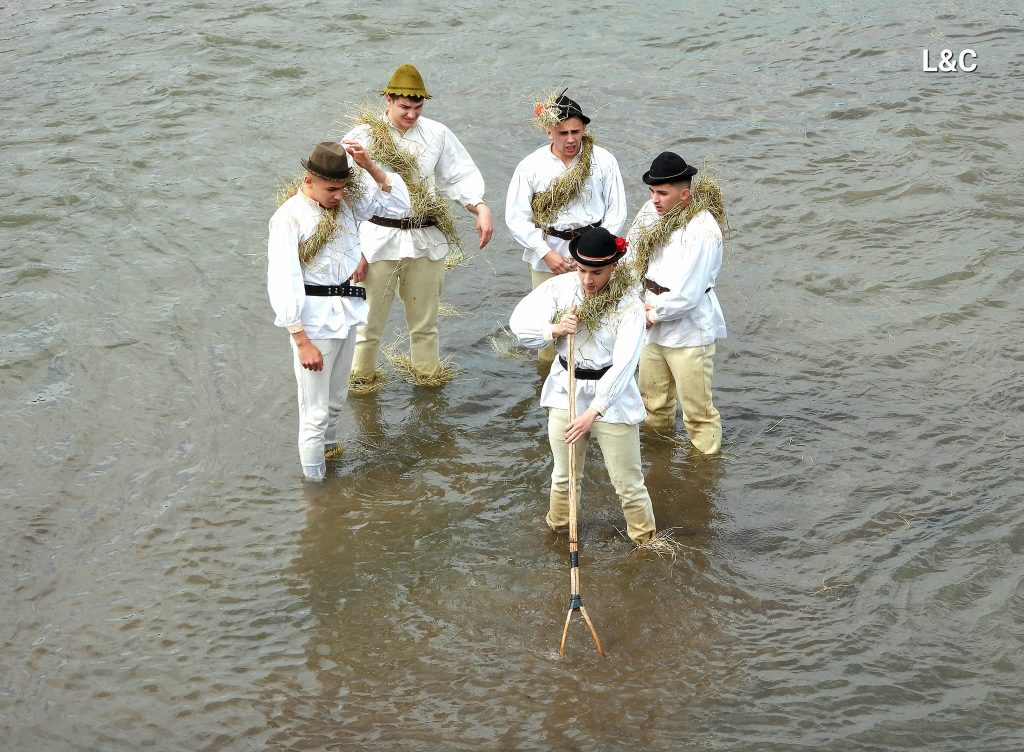 După ce ajungeau la râu, unde era adunată întreaga obşte a satului, plugarul intra în apă, agăţa grapa de pocimp, cu lopata făcea pe apă trei semne în formă de cruce şi începea să stropească lumea adunată pe malurile râului. În forma tradiţională, după stropirea publicului, plugarul îşi recita, cu glas puternic cântecul adresat naturii pentru a slobozi ploile, ca să rodească ogoarele; cântecul original s-a pierdut. La un moment dat, chezaşii, care până atunci stăteau pe marginea râului, se aruncau asupra plugarului, ca să-l trântească în apă. Se încingea o luptă aprigă între pugar şi chezaşi. Lupta trebuia să fie dreaptă, bărbătească, fără să se folosească metode necinstite. Dacă vreunul dintre feciori încerca să folosească vreo metodă nepermisă, publicul îl admonesta. Desigur, forţele erau inegale, patru contra unu; totuşi lupta ţinea câteva minute, pentru căfiecare chezaş căuta să trântească el plugarul şi acesta, tras în patru părţi în acelaşi timp,reuşea să-şi menţină echilibrul. După ce chezaşii izbuteau să trântească plugarul în apă, începea lupta între ei şi, rând pe rând, se rostogoleau în apa râului. Desfăşurarea acestei lupte bărbăteşti, cinstite, crea entuziasm; în cele din urmă publicul încuviinţa încetarea luptei. Chezaşii puneau plugarul pe grapă şi porneau cu alai spre gospodăria acestuia, unde erau aşteptaţi de mame cu haine de schimb, mâncau şi, după un răgaz de două ore, porneau cu muzică spre locul unde se desfăşura jocul; în trecut, în mijlocul satului sau pe prund, mai recent la Căminul Cultural. În forma tradiţională, după ce plugarul venea de la vale, întreaga comunitate a satului se deplasa la pădure, la iarbă verde, unde se desfăşura masa comună a obştei şi unde, probabil, urmau şi alte manifestaţii legate de munca ogoarelor“.