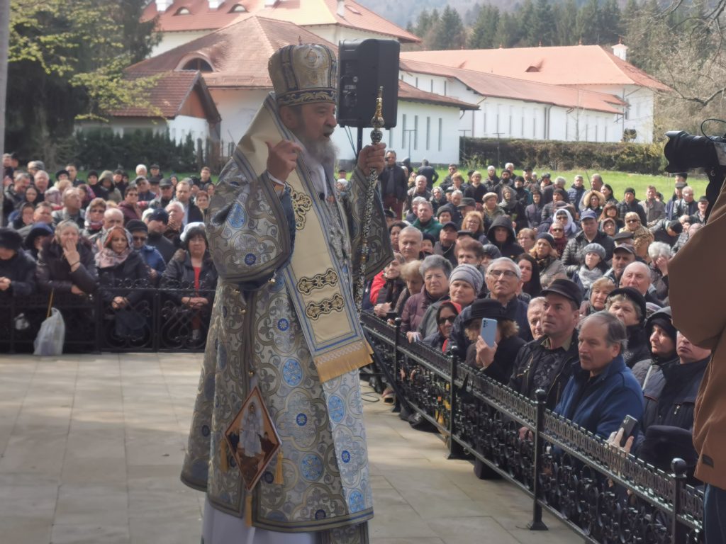 • ,,Frumusețea și semnificația acestei sărbători și rolul pe care Maica Domnului îl are în istoria mântuirii. Mănăstirea aceasta are o tradiție istorică binecuvântată, că atunci când a fost dărâmată a rămas Izvorul Maicii Domnului. Și la acest izvor veneau credincioșii din zonă și se rugau pentru că biserica era dărâmată, turla era dărâmată prin tunul lui Bukow. Iată că a rânduit Dumnezeu prin mijlocirea Maicii Preacurate ca acest loc să se dezvolte și să ne ofere nouă ceea ce avem noi nevoie mai presus de toate, putere în credință, eșența în încercările vieții și mai ales a greutăților ce vin asupra noastră și ne provoacă la o teamă, care este foarte periculoasă, ea duce la moarte înainte de vreme. Pentru a avea această tărie în credința noastră, Săptămâna Luminată în care noi prăznuim Izvorul Tămăduirii ne oferă încrederea pe care noi trebuie să o avem în Dumnezeu și mai ales în șansa de a ne împărtăși cu Însuși Mântuitorul Iisus Hristos prin Sfânta Împărtășanie. Dacă în prima zi, după Înviere, Mântuitorul s-a arătat și a binecuvântat cu ,,Pace Vouă!“, nu aveau nevoie de altceva cei care stăteau ascunși de frica iudeilor. I-a binecuvântat și i-a trimis la propovăduire cu puterea de a economisi, de a vindeca, să fie iconomi ai tainelor lui Dumnezeu. N-a fost Toma de față, dar după 8 zile, Mântuitorul se va arăta din nou ucenicilor și lui Toma și prin Toma noi toți devenim cei care simțim cu adevărat că Mântuitorul Iisus Hristos a Înviat pentru noi și a noastră mântuire. În ce mod ne putem atinge noi de Mântuitorul Iisus Hristos, într-un mod binecuvântat și cu totul special“ a spus IPS Laurențiu în predică.