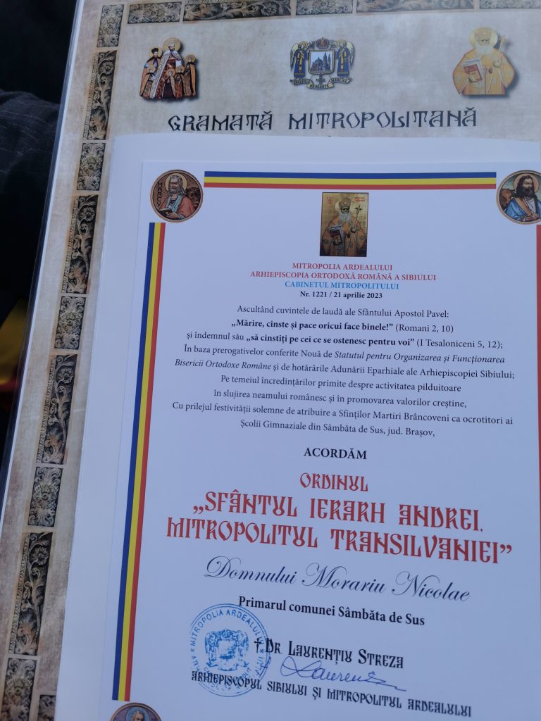 IPS Laurențiu a vorbit despre evenimentul care urma la Sâmbăta de Sus prin care Școala gimnazială va intra sub ocrotirea Sfinților Martiri Brâncoveni. A înmânat simboluri creștinești (Crucea  Șaguniană) oficialilor prezenți la slujba de hram, dar și preoților care au slujit la bisericile din satul Sâmbăta de Sus. Au primit Crucea Șaguniană primarul Comunei Sâmbăta de Sus, Nicolae Morariu, Inspectorul Școlar General de la IȘJ Brașov, Ovidiu Florin Tripșa, inspectorul școlar de religie, Elena Popa, directoarea Școlii Gimnaziale Sâmbăta de Sus, prof. Adina Moldovan, preot Marcel Dobre. (Lucia BAKI)