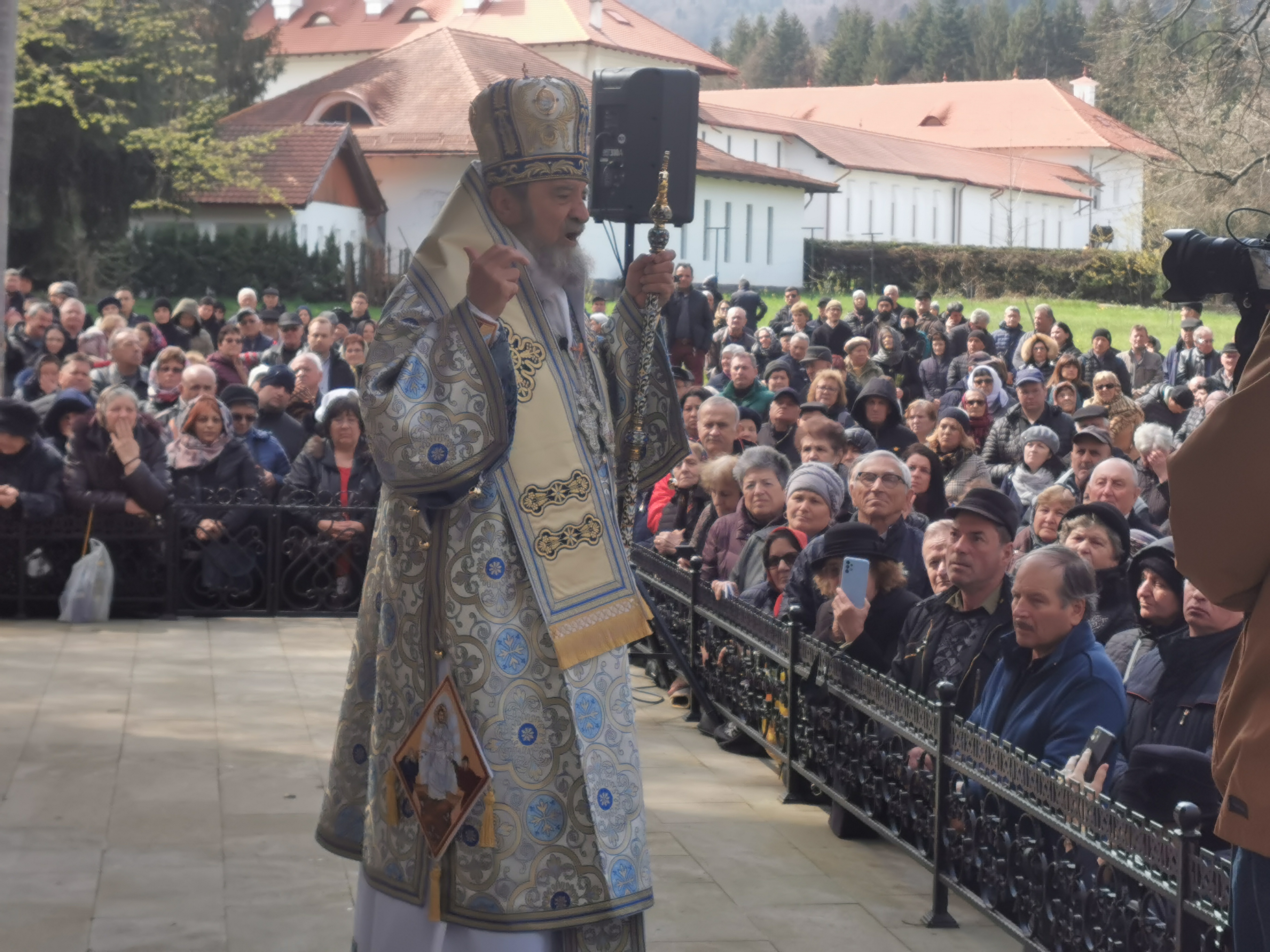 - ,,Frumusețea și semnificația acestei sărbători și rolul pe care Maica Domnului îl are în istoria mântuirii. Mănăstirea aceasta are o tradiție istorică binecuvântată, că atunci când a fost dărâmată a rămas Izvorul Maicii Domnului. Și la acest izvor veneau credincioșii din zonă și se rugau pentru că biserica era dărâmată, turla era dărâmată prin tunul lui Bukow. Iată că a rânduit Dumnezeu prin mijlocirea Maicii Preacurate ca acest loc să se dezvolte și să ne ofere nouă ceea ce avem noi nevoie mai presus de toate, putere în credință, eșența în încercările vieții și mai ales a greutăților ce vin asupra noastră și ne provoacă la o teamă, care este foarte periculoasă, ea duce la moarte înainte de vreme. Pentru a avea această tărie în credința noastră, Săptămâna Luminată în care noi prăznuim Izvorul Tămăduirii ne oferă încrederea pe care noi trebuie să o avem în Dumnezeu și mai ales în șansa de a ne împărtăși cu Însuși Mântuitorul Iisus Hristos prin Sfânta Împărtășanie. Dacă în prima zi, după Înviere, Mântuitorul s-a arătat și a binecuvântat cu ,,Pace Vouă!“, nu aveau nevoie de altceva cei care stăteau ascunși de frica iudeilor. I-a binecuvântat și i-a trimis la propovăduire cu puterea de a economisi, de a vindeca, să fie iconomi ai tainelor lui Dumnezeu. N-a fost Toma de față, dar după 8 zile, Mântuitorul se va arăta din nou ucenicilor și lui Toma și prin Toma noi toți devenim cei care simțim cu adevărat că Mântuitorul Iisus Hristos a Înviat pentru noi și a noastră mântuire. În ce mod ne putem atinge noi de Mântuitorul Iisus Hristos, într-un mod binecuvântat și cu totul special“ a spus IPS Laurențiu în predică.