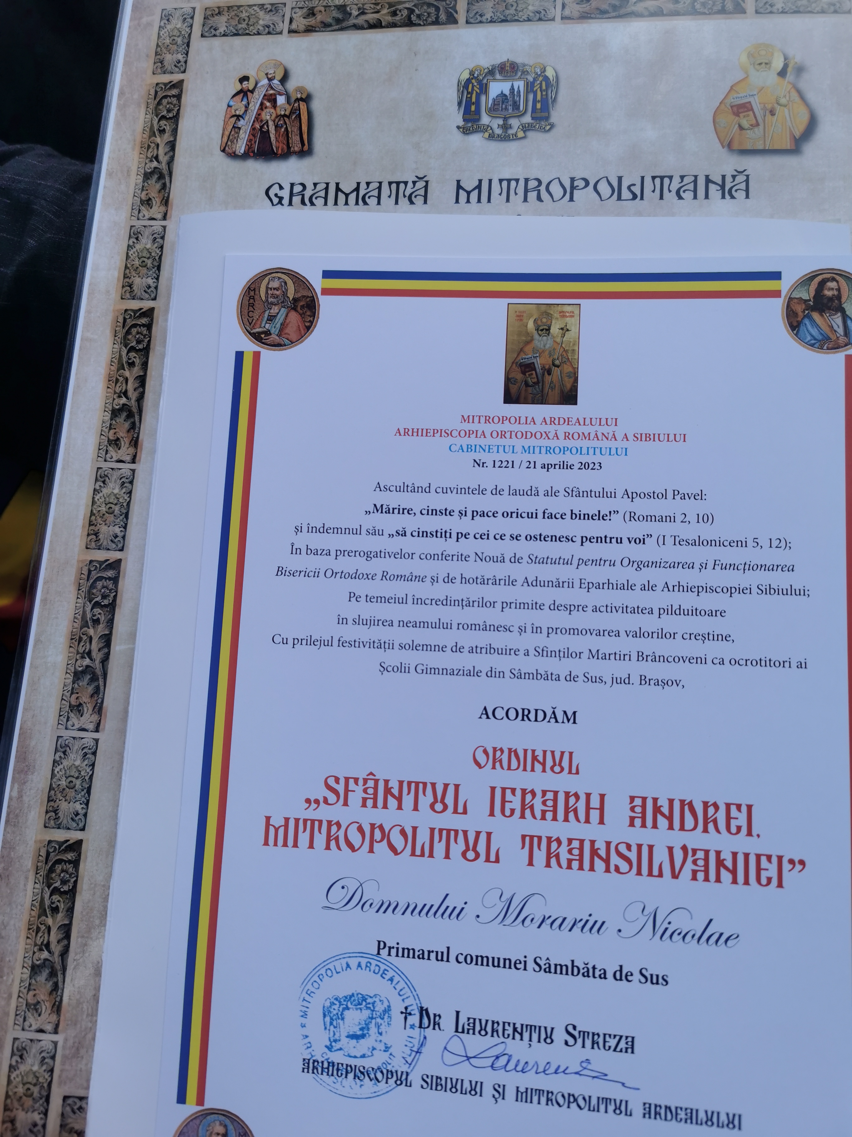 IPS Laurențiu a vorbit despre evenimentul care urma la Sâmbăta de Sus prin care Școala gimnazială va intra sub ocrotirea Sfinților Martiri Brâncoveni. A înmânat simboluri creștinești (Crucea Șaguniană) oficialilor prezenți la slujba de hram, dar și preoților care au slujit la bisericile din satul Sâmbăta de Sus. Au primit Crucea Șaguniană primarul Comunei Sâmbăta de Sus, Nicolae Morariu, Inspectorul Școlar General de la IȘJ Brașov, Ovidiu Florin Tripșa, inspectorul școlar de religie, Elena Popa, directoarea Școlii Gimnaziale Sâmbăta de Sus, prof. Adina Moldovan, preot Marcel Dobre. (Lucia BAKI)