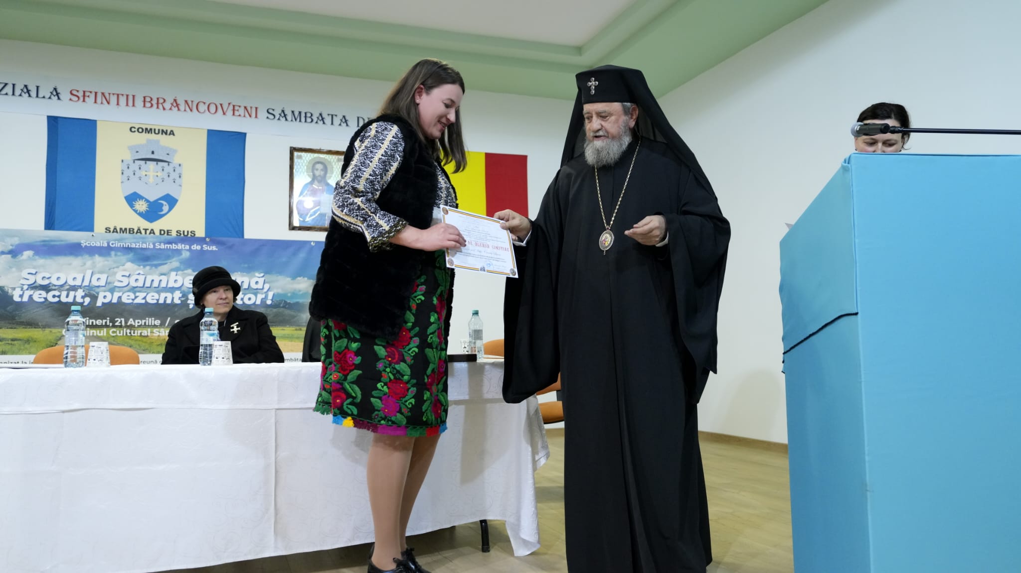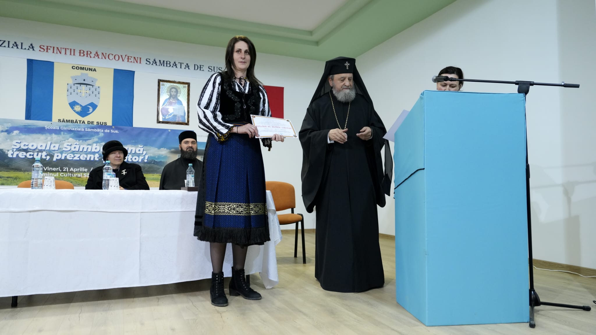 ,,Sfinții Martiri Brâncoveni au marcat profund viața și istoria poporului nostru, prin credința lor fierbinte de care nu s-au despărțit nici în fața morții, dar și prin preocupările lor social-culturale izvorâte din iubirea jertfelnică față de Biserica străbună și neamul românesc. Domnia Sfântului Constantin Brâncoveanu a început sub semnul apariției Bibliei în limba română, numită ,,Biblia din București“, în anul 1688. A avut una din cele mai lungi domnii din istoria principatelor române, Țara Românească cunoscând în timpul său o lungă perioadă de pace, de înflorire culturală și de dezvoltare a vieții spirituale. Numărul mare de ctitorii bisericești, printre care și Mănăstirea Brâncoveanu de la Sâmbăta de Sus, precum și mulțimea școlilor pe care le-a înființat atât în Țara Românească, dar și în Transilvania, poartă peste timp ecoul vredniciei, dar și mireasma sfințeniei Celui care a plătit cu viața lui și a copiilor lui, iubirea pentru Biserica Ortodoxă și a Nemului Românesc. În toată viața sa, a urmat modelul Sfinților Împărați Constantin și Elena de la care a învățat să construiască mănăstiri, școli, să trăiască întru Hristos, să fie un adevărat conducător de stat, înțelept, apărând viața poporului pe care-l conduce.  Așezarea Școlii Gimnaziale din Sâmbăta de Sus sub ocrotirea Sfinților Martiri Brâncoveni este pentru noi o mare bucurie și împlinire sufletească, dar și o aleasă binecuvântare de Sus pentru întreaga comunitate locală din Sâmbăta de Sus, pentru elevii școlii și dascălii lor“ semnează   IPS Laurențiu, Mitropolitul Ardealului.  (Lucia BAKI)