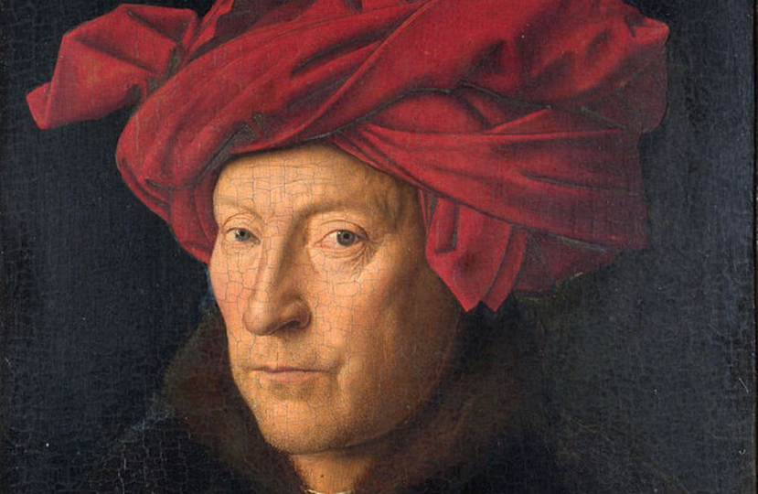 Portretul de bărbat (cu turban roşu) a fost multă vreme considerat un autoportret. Exoticul acoperământ al capului, de culoare roşie, apare în reflexe ale obiectelor în alte lucrări ale lui Van Eyck, precum Portretul soţilor Arnolfini. O inscripţie, cu litere aparent sculptate, a fost pictată pe rama originală, imitând marmura. Pe rândul de sus scrie Als ich kan, considerat a fi un joc de cuvinte de la numele de familie al lui Van Eyck (în traducere’’ Ca mine/Eyck poate’’). Numele pictorului şi data (’’Jan van Eyck m-a pictat la 21 octombrie 1433’’) apar în josul ramei. Chiar dacă este sau nu un autoportret, pictura are o forţă extraordinară. Realizate pe un fundal uniform întunecat, trăsăturile personajului se disting într-o lumină pătrunzătoare care cade din stânga. Mici puncte de lumină, de la ferestrele atelierului, se zăresc în irişii personajului. Acesta se uită direct în ochii privitorului. Nimic nu ne distrage atenţia de la această faţă deosebită, de la ridurile de expresie din jurul ochilor, la barba uşor nerasă.
