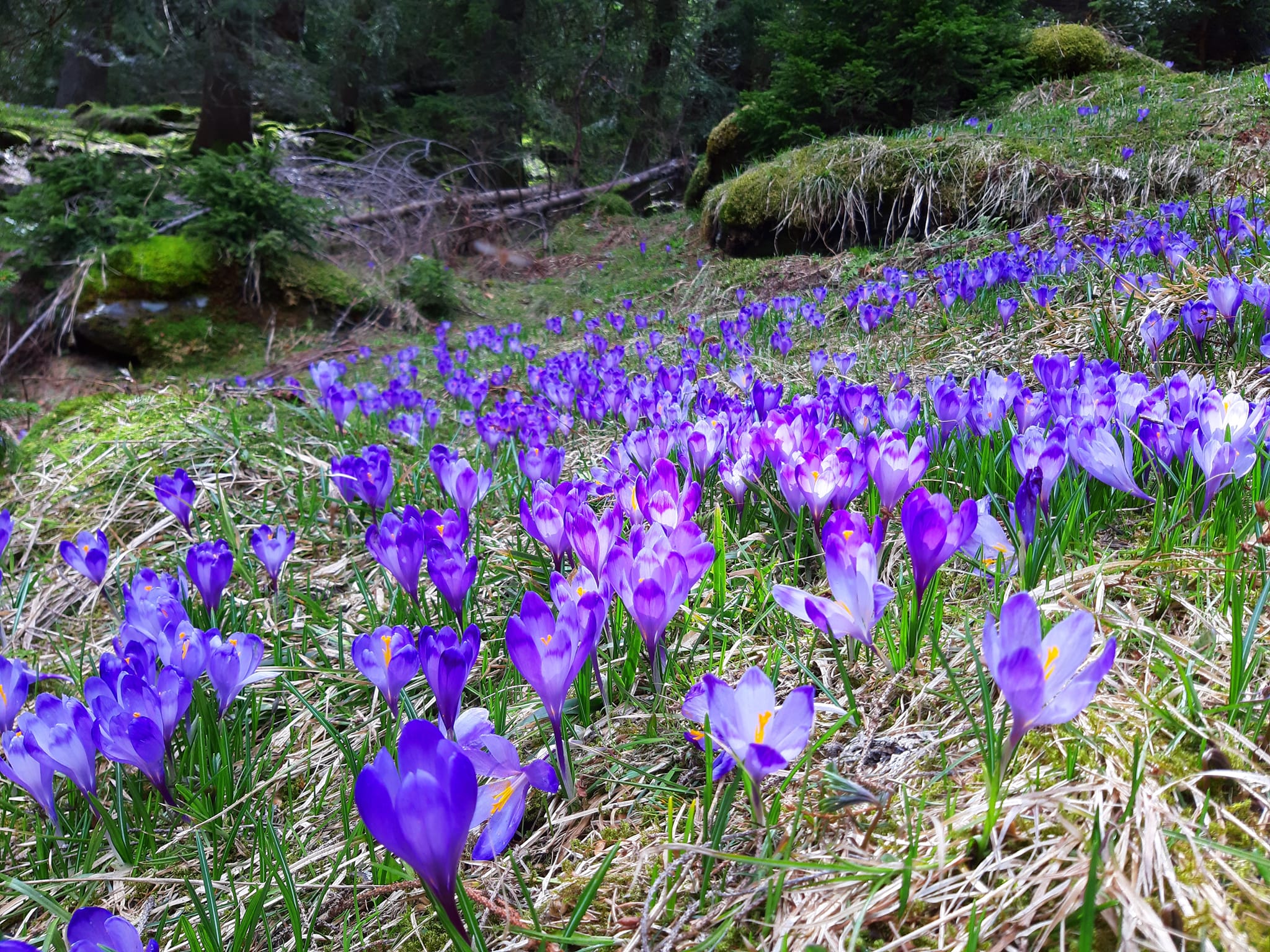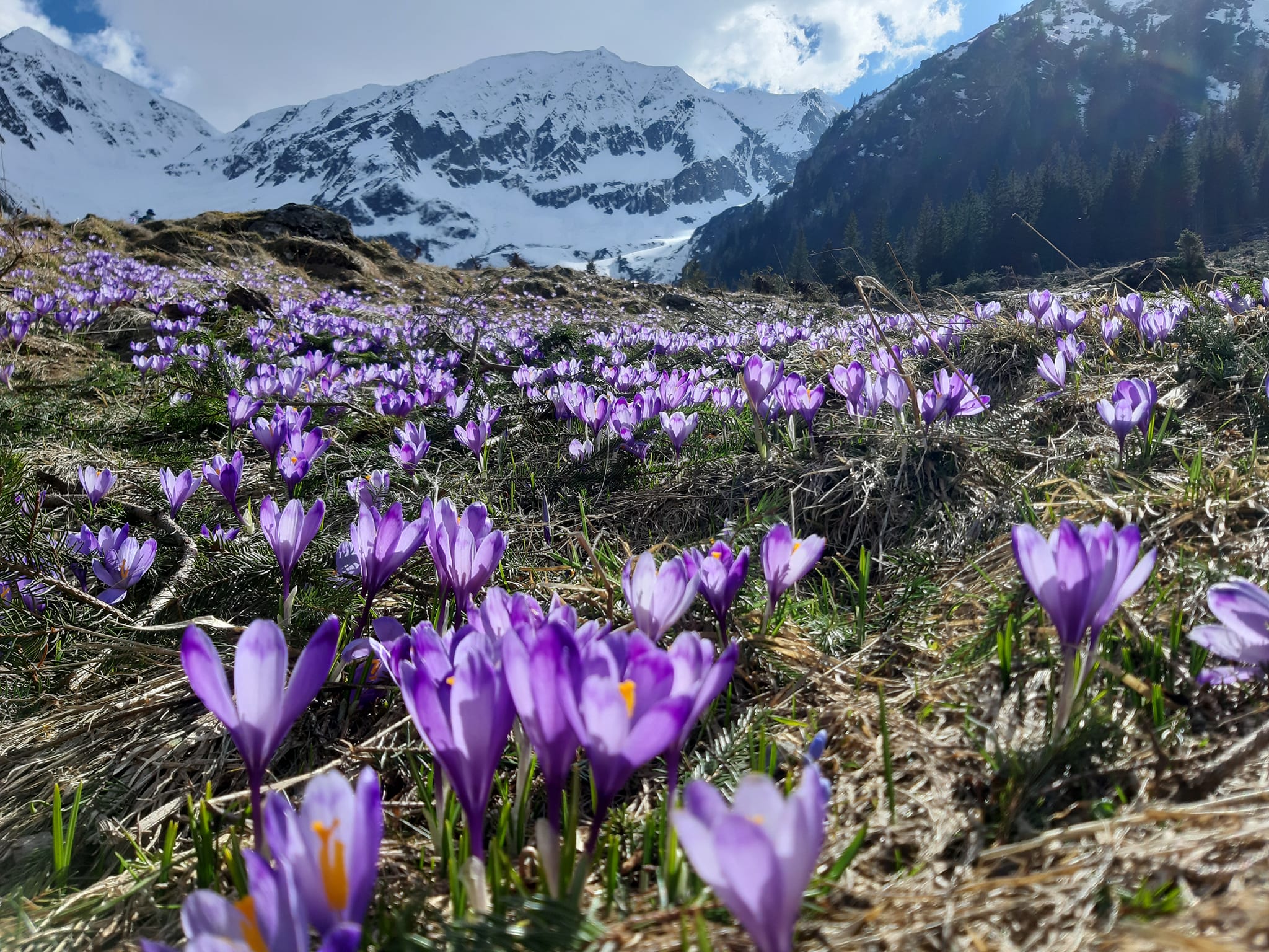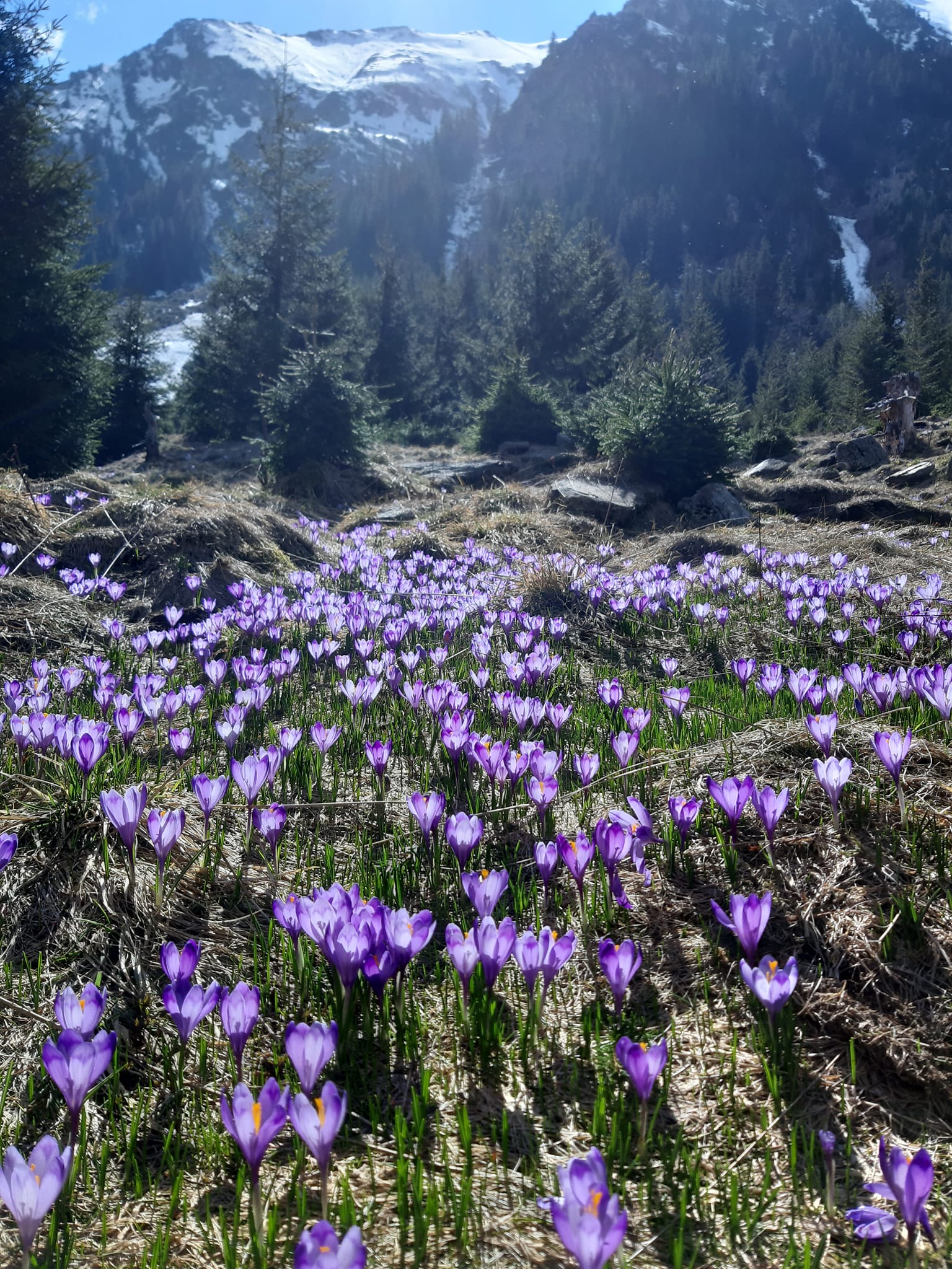 Foto. Feerie pe Valea Sâmbetei dată de miile de brândușe mov înflorite