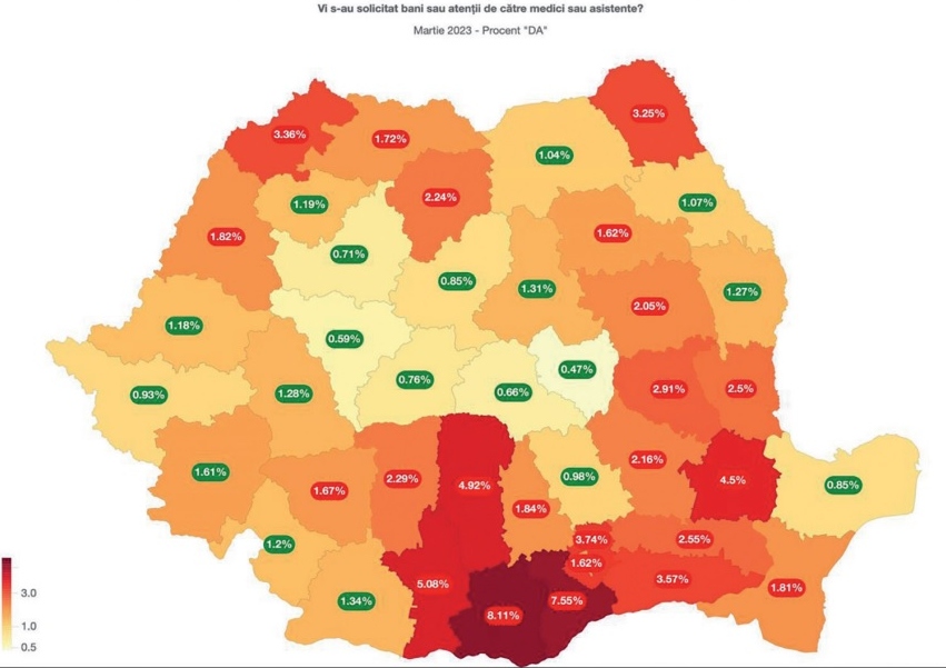 Topul răspunsurilor pozitive la întrebarea „Doriți să raportați responsabilului anticorupție al Ministerului Sănătății faptul că vi s-au solicitat bani sau atenții?”