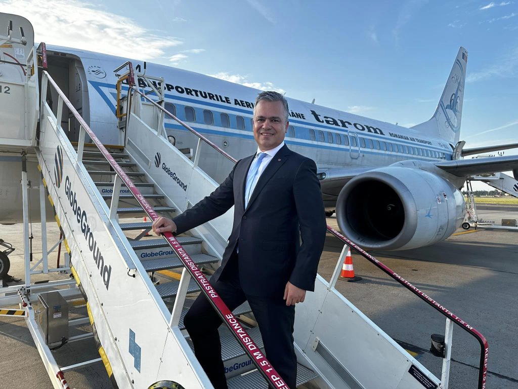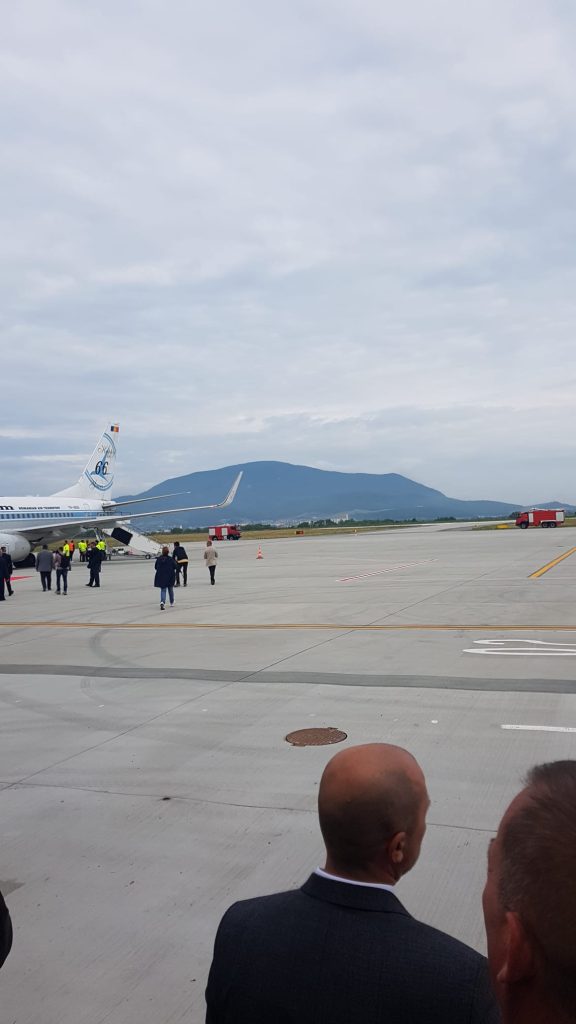 Primul avion a aterizat pe aeroportul Brașov-Ghimbav joi, 15 iunie 2023, la ora 8.30. A fost cursa care a inaugurat noul obiectiv realizat de Consiliul Județean Brașov, primul de acest tip din ultimii 50 de ani din România. Aparatul de zbor al companiei naţionale TAROM, pilotat de fiul lui Dumitru Prunariu, singurul cosmonaut pe care l-a dat România, a plecat de la București la ora 8.10, la bordul căruia au fost oficialii Adrian Veștea, președintele CJ Brașov, Nicolae Ciucă, fostul premier, Sorin Grindeanu, ministrul Transporturilor și alții. Cursa a fost întâmpinată pe aeroportul de la Brașov de reprezentanții administrațiilor publice locale din județ: CJ Brașov, primarii din județ. Mitropolitul Ardealului, Laurențiu Streza, a făcut parte din delegația care a întâmpinat pe aeroport aeronava. A fost prezent la zborul inaugural și Aristotel Căncescu, fostul președinte al CJ Brașov, cel care a inițiat investiția după anul 2000. După aterizare a fost tăiată panglica de către Adrian Veștea, Nicolae Ciucă și Sorin Grindeanu. A urmat o slujbă religioasă oficiată de mitropolitul Ardealului și preotul paroh de la Ghimbav.